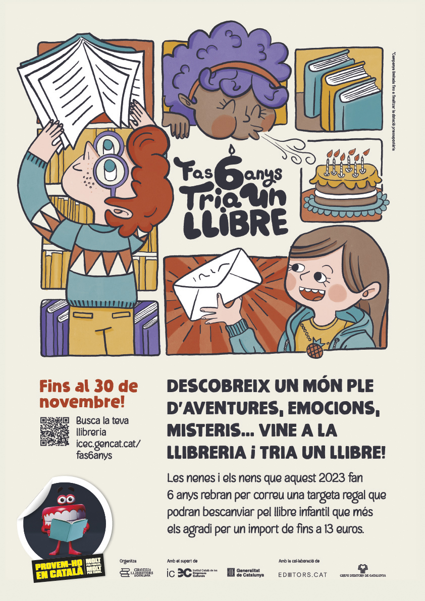 mpanya ”Fas 6 anys. Tria un llibre” tindrà lloc entre el 16 d’octubre i el 30 de novembre. Serà durant aquest període que tots els nens i nenes que han fet o faran 6 anys aquest 2023 podran bescanviar la targeta que hauran rebut a casa seva per un llibre, el que més els agradi, a la llibreria més propera.