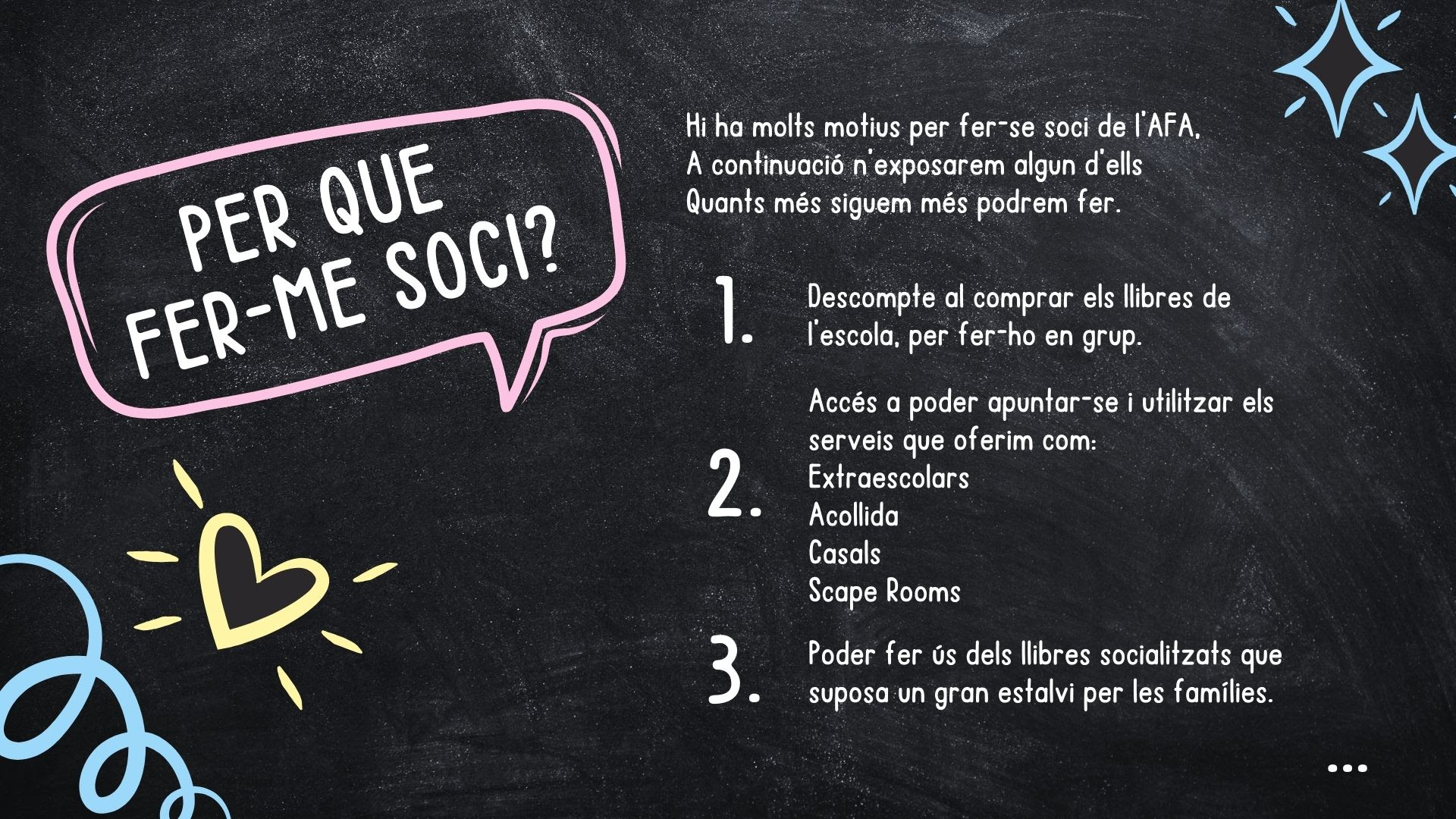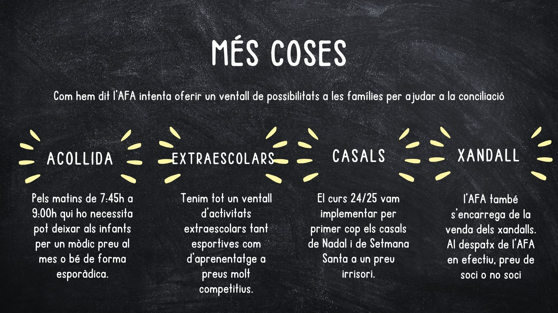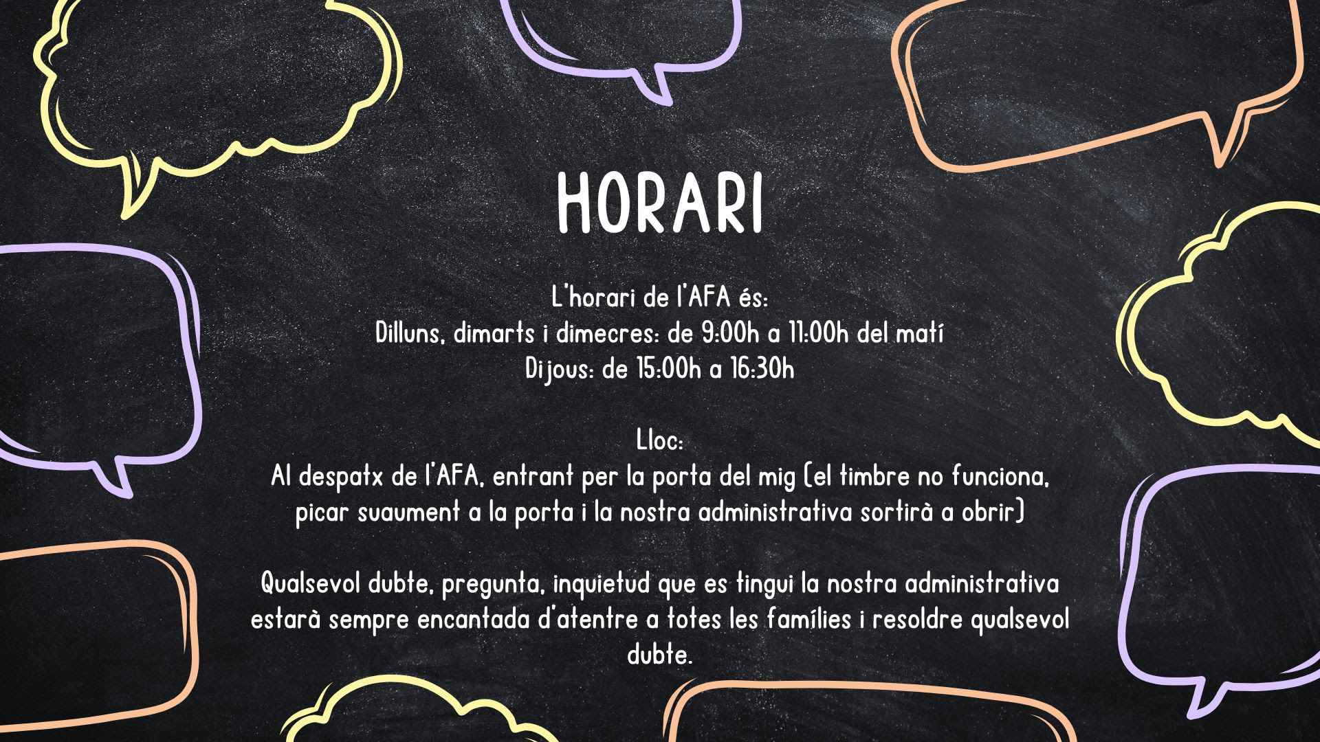 Us animem a formar part de l’AFA de l’escola. Som un grup de famílies compromeses amb l’educació i el benestar dels nostres infants, i treballem colze a colze amb l’escola per fer-la una mica millor cada dia.