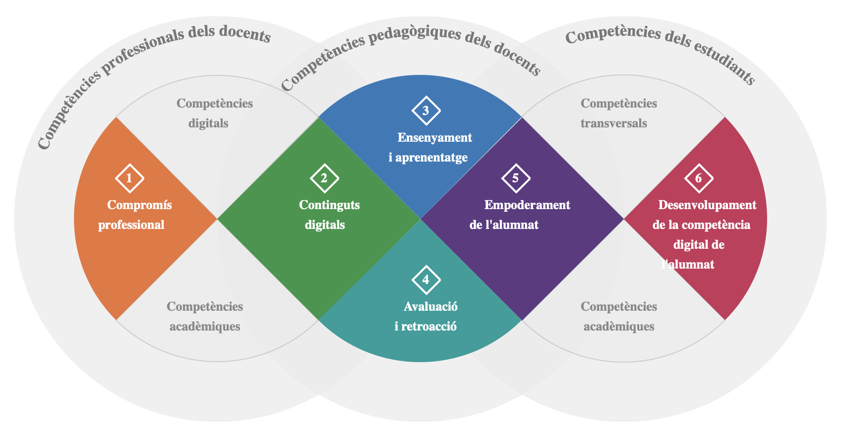 Tenim com a consulta de capçalera per saber quines àrees abarca la competència digital docent aquest enllaç de la pàgina interactiva del Marc de la CDD. Amb aspectes bàsics com el compromís professional, entès com la protecció del benestar de l’alumnat i el seu adequat desenvolupament intel·lectual, físic i psicològic, la participació en el centre, la col·laboració amb les famílies, l’acció responsable en l’entorn i amb el seu propi desenvolupament professional. Per tant, la competència digital docent no solament s’ha de referir a la capacitat per utilitzar les tecnologies digitals per millorar l’ensenyament i l’aprenentatge, sinó també per a l’acompliment adequat de totes les tasques relacionades amb l’exercici professional.