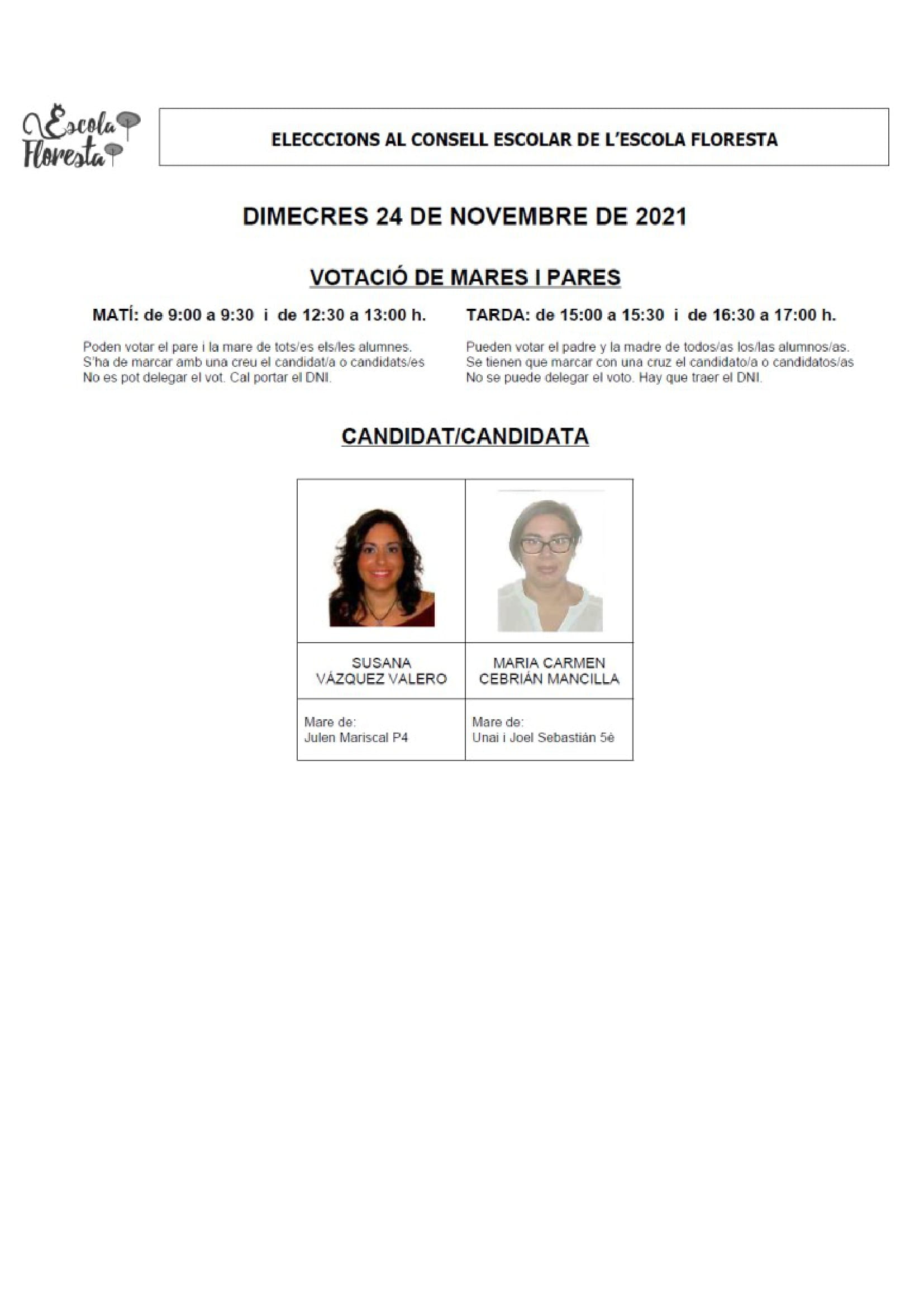 ELECCIONS CONSELL ESCOLAR admin18/11/21 Benvolgudes famílies, Us comuniquem les dues candidatures del sector de pares o tutors legals que s’han presentat a les eleccions al consell escolar 2021. Moltes gràcies