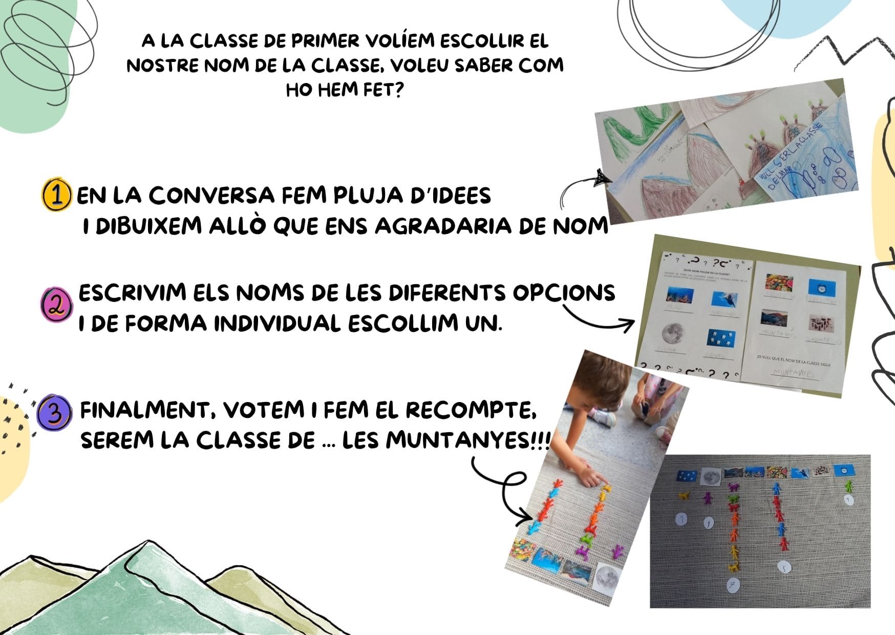 A primer ja estem agafant el ritme del pas a primària, de mica en mica ens anem acostumant a les noves dinàmiques i ens estem esforçant de valent. Junt amb altres propostes hem escollit el nom de la classe, després de fer pluja d’idees, conversar i votar, serem la classe de les muntanyes! Quina gran aventura!