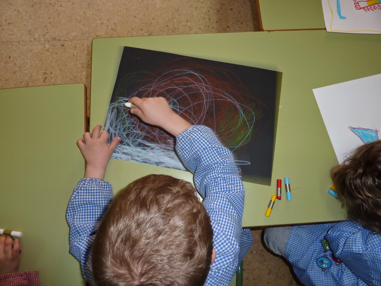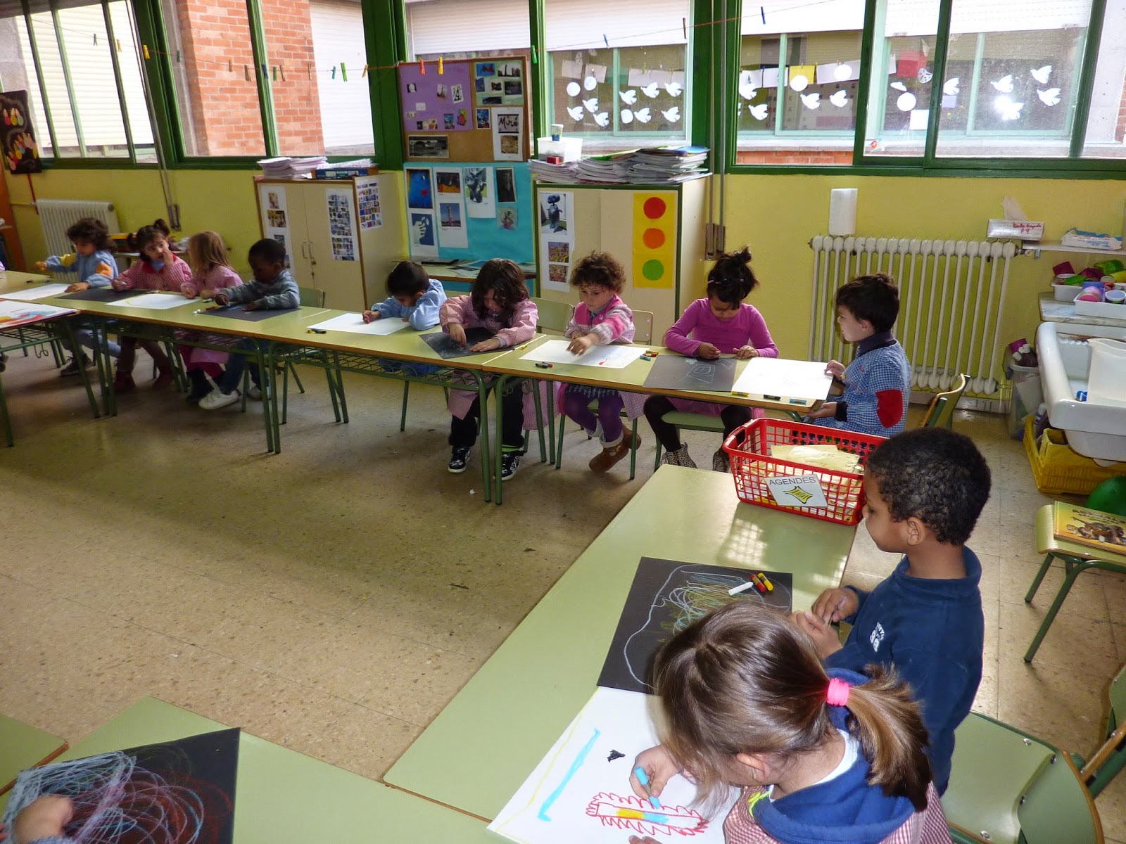 Aquests dies estem treballant molt immersos en el món de Joan Miró. Tenim un racó a la classe que cal anar omplint, representem quadres amb el cos a l’aula de psicomotricitat, experimentem amb els colors primaris i els diferents colors del paper (blanc o negre) i ens hem fet uns autoretrats amb pintura negra sobre fons de color. De moment us deixem les fotos de quan vam fer el fons de l’autoretrat i algunes de la creació amb fons blanc o negre.