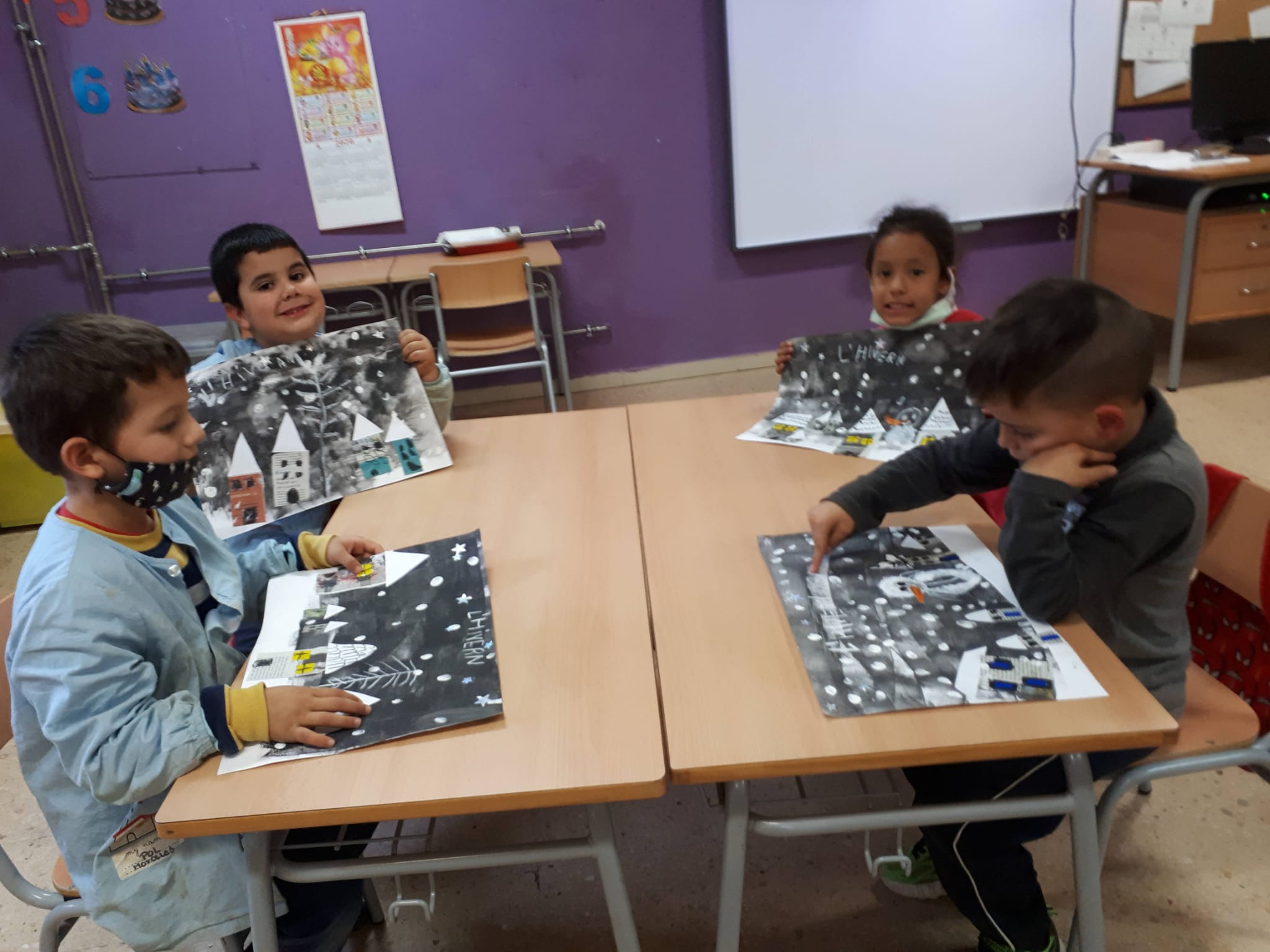 A més a més, hem pintat amb ceres amb els colors de l’hivern, rosa, negre, lila, blau i gris i hem fet un mural pel nostre passadís. Hem après que hi ha colors freds i càlids.