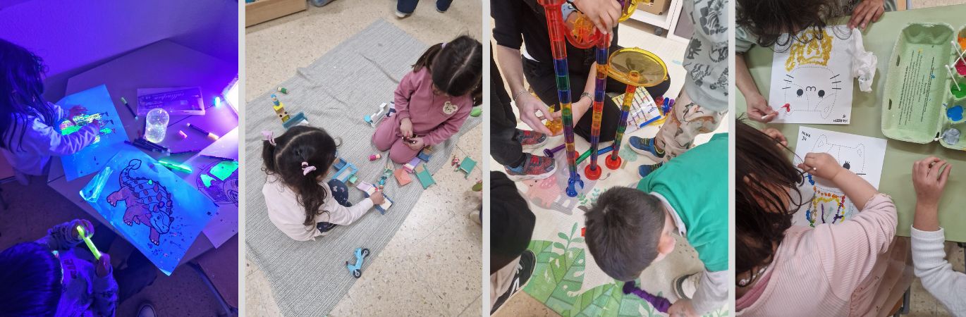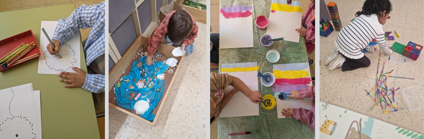 - A l’ambient de motricitat fina hi ha plantilles i segells, puntillisme i propostes de creació de polseres per seguir practicant la pinça i l’habilitat amb les mans de manera divertida.