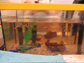 Els alumnes de primer tenim cura i estudiem els guppys. Cada dia els hi posem menjar, els observem. Sovint afegim
