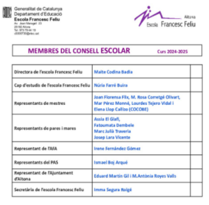 Llegides les actes de votació de cada sector, la composició resultant del CONSELL ESCOLAR DE CENTRE DE L’ESCOLA  FRANCESC FELIU és la següent: