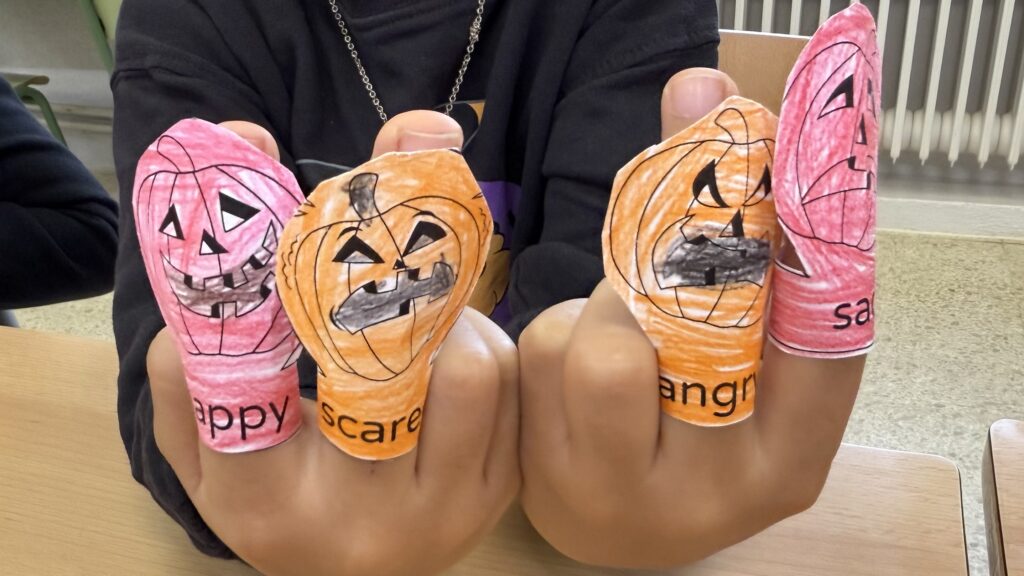 A 1r hem fet uns finger puppets de Halloween ben divertits! Hem aprofitat l’activitat per treballar els sentiments que hem après amb les Super Simple Songs, expressant com se sentien els nostres personatges: happy, scared, angry… Una estona creativa i plena d’emocions!