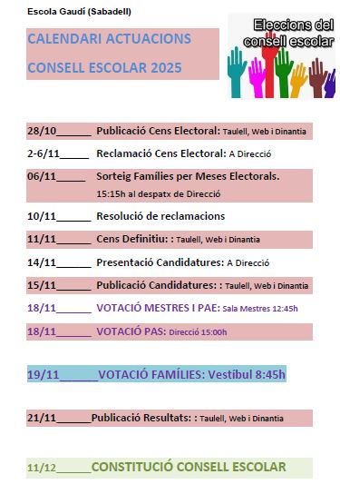 - El 14 de novembre s’han de presentar les candidatures per tal de formar part del Consell Escolar del centre, com a representants de pares i mares.