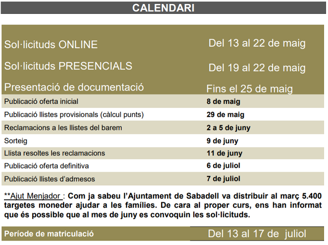 - 23 de maig al 5 de juny: Sol·licituds FORA DE TERMINI, i amb documentació enviada al correu oficial de l’escola: a8023943@xtec.cat