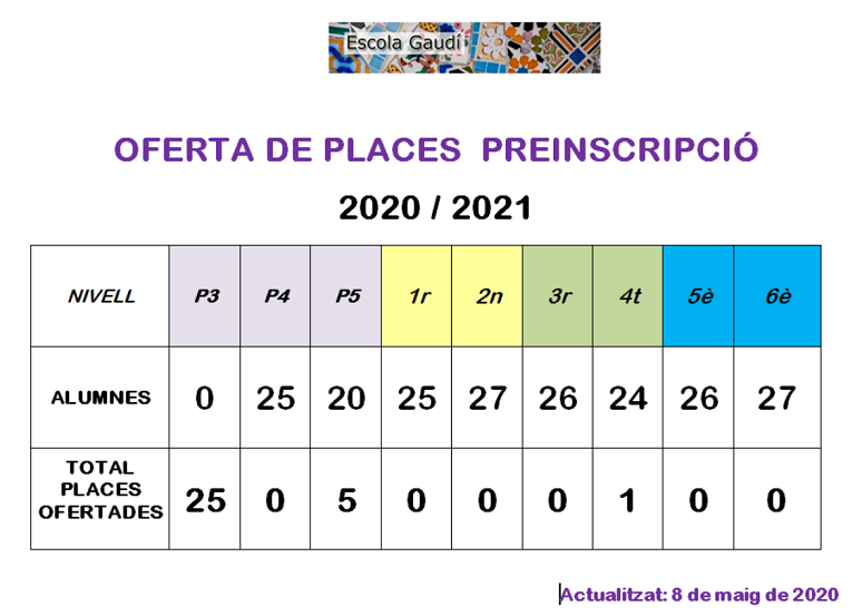 IMPORTANT: Totes les famílies que han sol·licitat plaça a P3 tenen la plaça assegurada al nostre centre.