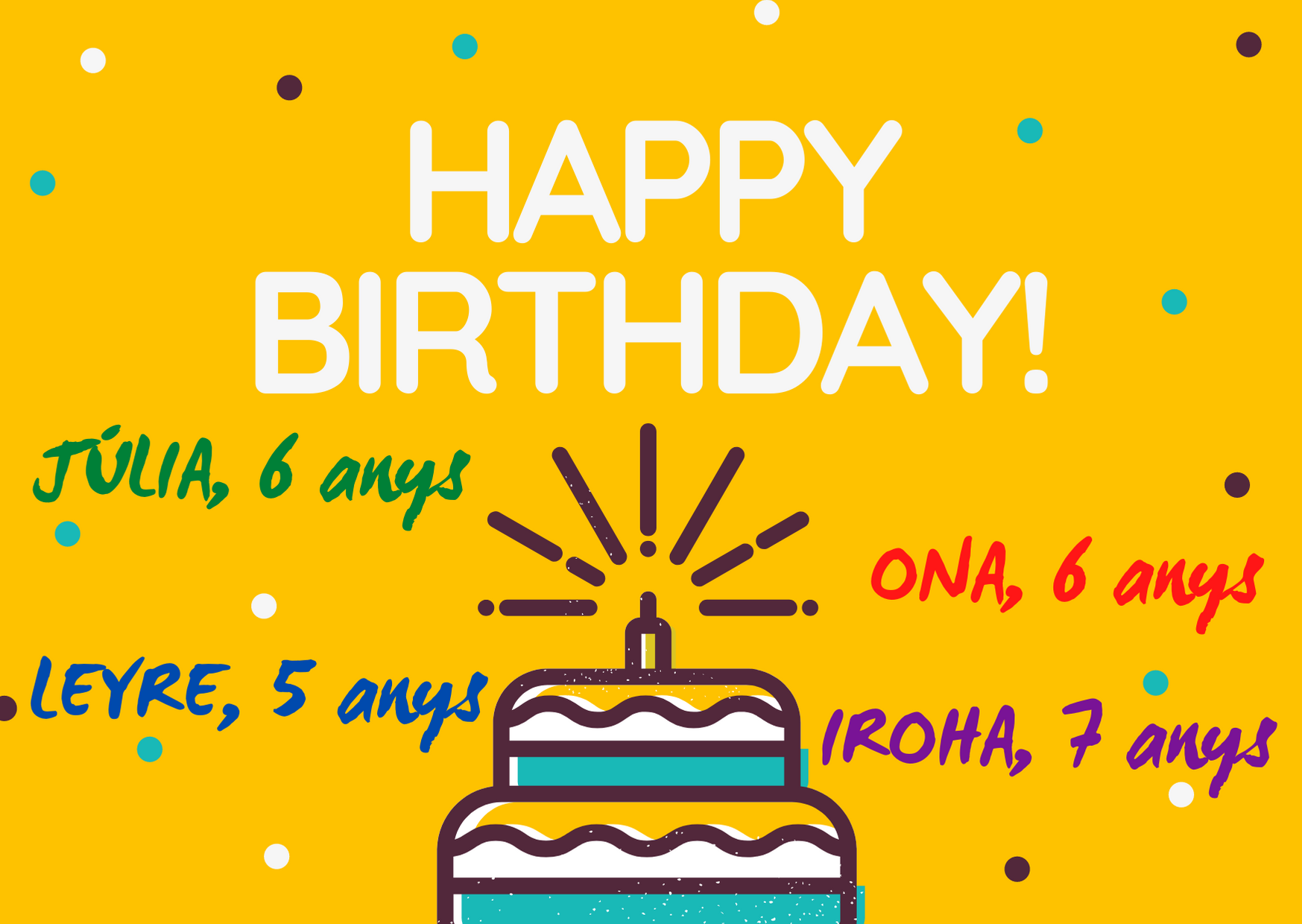 Avui no fa anys una nena, ni dues, ni tres…sino quatre, quatre companyes del cole!!!!: La Leyre (5 anys), l’Ona i la Júlia (6 anys), i la Iroha (7 anys). Esperant poder celebrar-ho junts llençarem un coet de focs articials per tots els anys que fan… shhhhhhh… pum!!!!!!!! Moltíssimes felicitats!!!!!