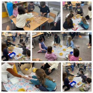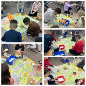 Els grups de 2n acabem el projecte de la Prehistòria amb una activitat de troc pròpia de l’Edat dels Metalls. Teníem cinc ciutats amb excedent de producció per fer intercanvi: metal·lúrgics, ramaders, agricultors, terrissaires i teixidors. Totes les ciutats han aconseguit obtenir una mica de cada producte.