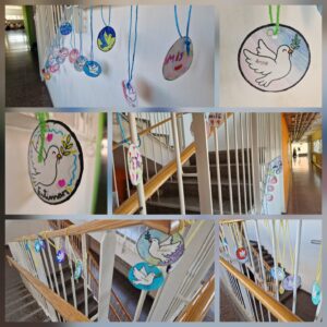 Celebració del Dia Escolar de la No Violència i la Pau cantant “Un Cel Blau” de Dani Miquel i emplenant de coloms i paraules de pau tota l’escola.