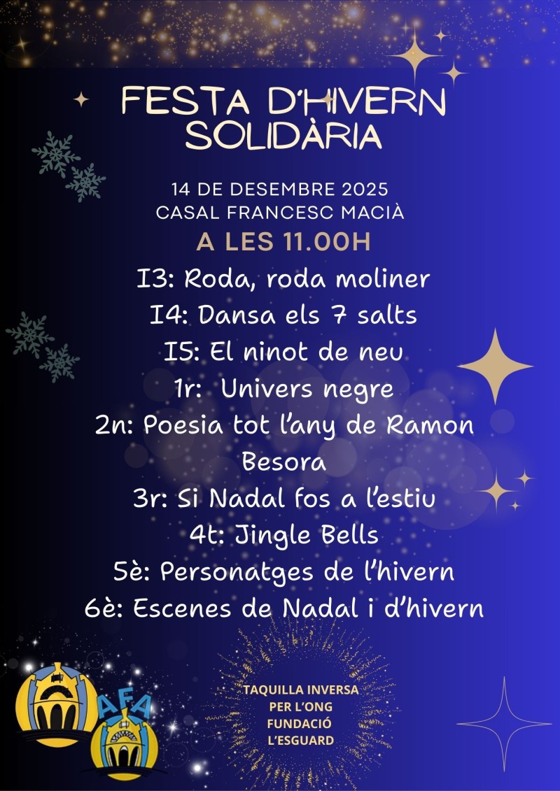 Aquest diumenge 14 de desembre se celebrarà la festa d’hivern solidària a les 11h al Casal Francesc Macià. Per primera vegada, tot l’alumnat farà una petita representació. La taquilla és inversa i tot el donatiu és donarà a la Fundació l’Esguard.
