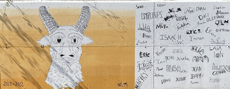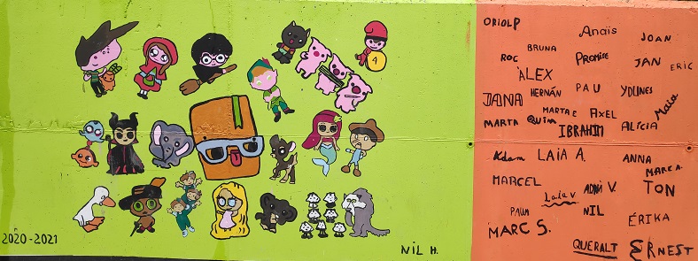 Els dibuixos del mur neixen d’un concurs que es fa amb els alumnes de l’edifici de dalt, a partir d’un tema escollit a la classe i gestionat pels delegats i delegades, hi ha unes bases a seguir. El dibuix més votat és el que es representa al mur. Els alumnes de 6è son els encarregats de dibuixar-lo i pintar-lo i deixar escrit els seus noms com a record pel seu pas a l’escola.