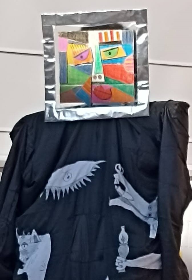 El Carnestoltes ha vingut a l’escola disfressat de quadres de Pablo Picasso, de l’època cubista. Al vestit que porta hi ha elements d’un quadre molt famós que es diu Guernica. Com que ja coneixíem una mica l’obra de Picasso, hem parlat de què representaven totes aquelles figures. Hem investigat i descobert moltíssimes coses d’aquest quadre: