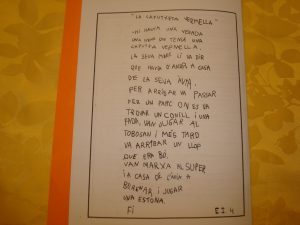 Aquest curs per la festa dels jocs florals hem inventat un conte entre tota la classe. Nosaltres vam crear una nova versió del conte de La Caputxeta Vermella.