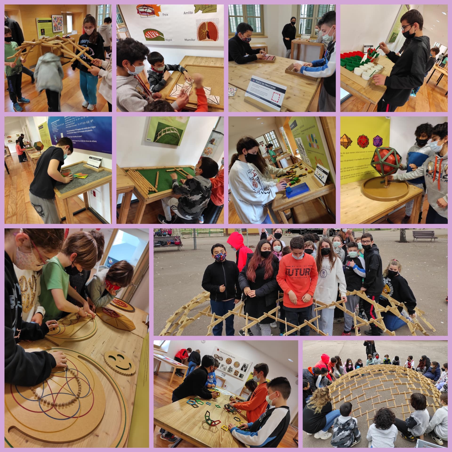 Els infants de sisè hem anat al Museu de les Matemàtiques, situat al Parc de Can Mercader a Cornellà. Vam construir, col·laborativament, una cúpula de Leonardo amb diferents formes geomètriques: quadrats, triangles i hexàgons. També vam posar en actiu totes les neurones jugant i resolent uns quants reptes matemàtics. Les mates són divertides!!