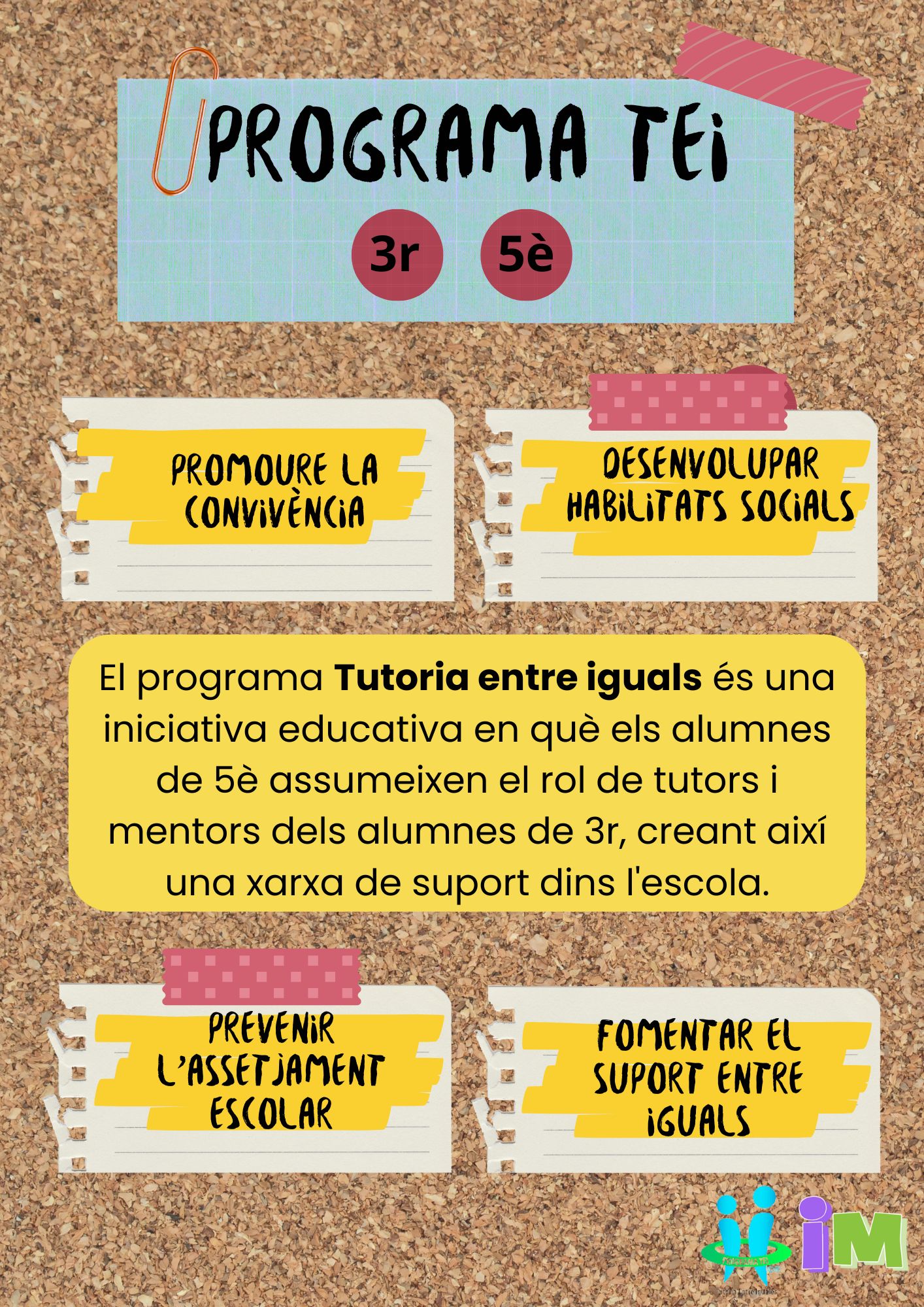 Des de fa anys a l’escola duem a terme el programa TEI (tutoria entre iguals). És un programa de convivència i prevenció de l’assetjament escolar impulsat per grups de treball de diverses universitats d’arreu de l’Estat.