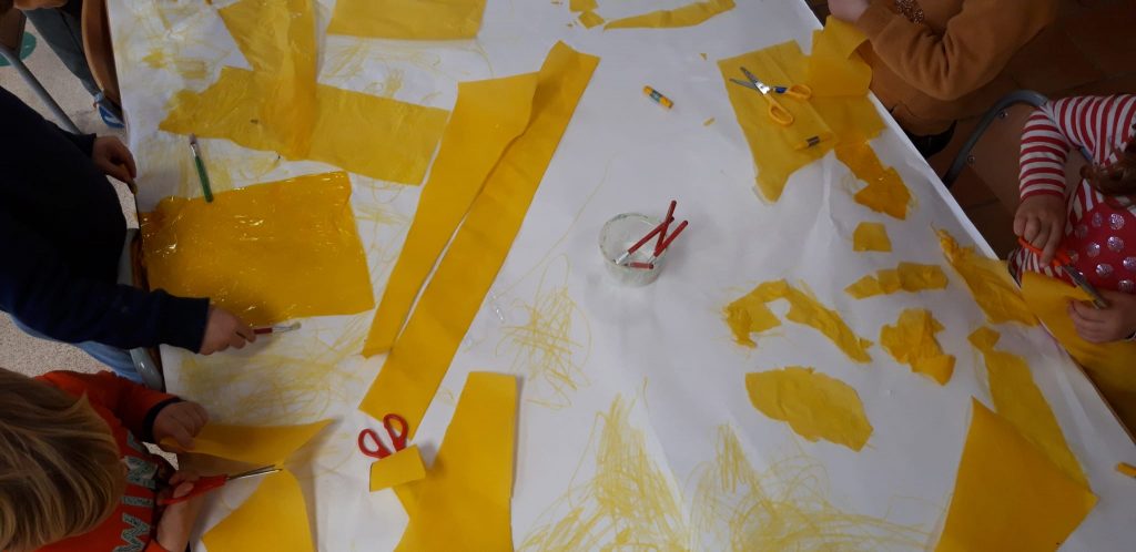 A P4 continuem treballant les emocions. Aquesta setmana entre tots hem fet un mural de l´alegria amb diferents materials de color groc com papers, teles, llanes… Hem enganxat i pintat amb aquest color mentre escoltàvem música alegra que ens fa estar contents. Ha sigut molt divertit i hem acabat tots ballant!!