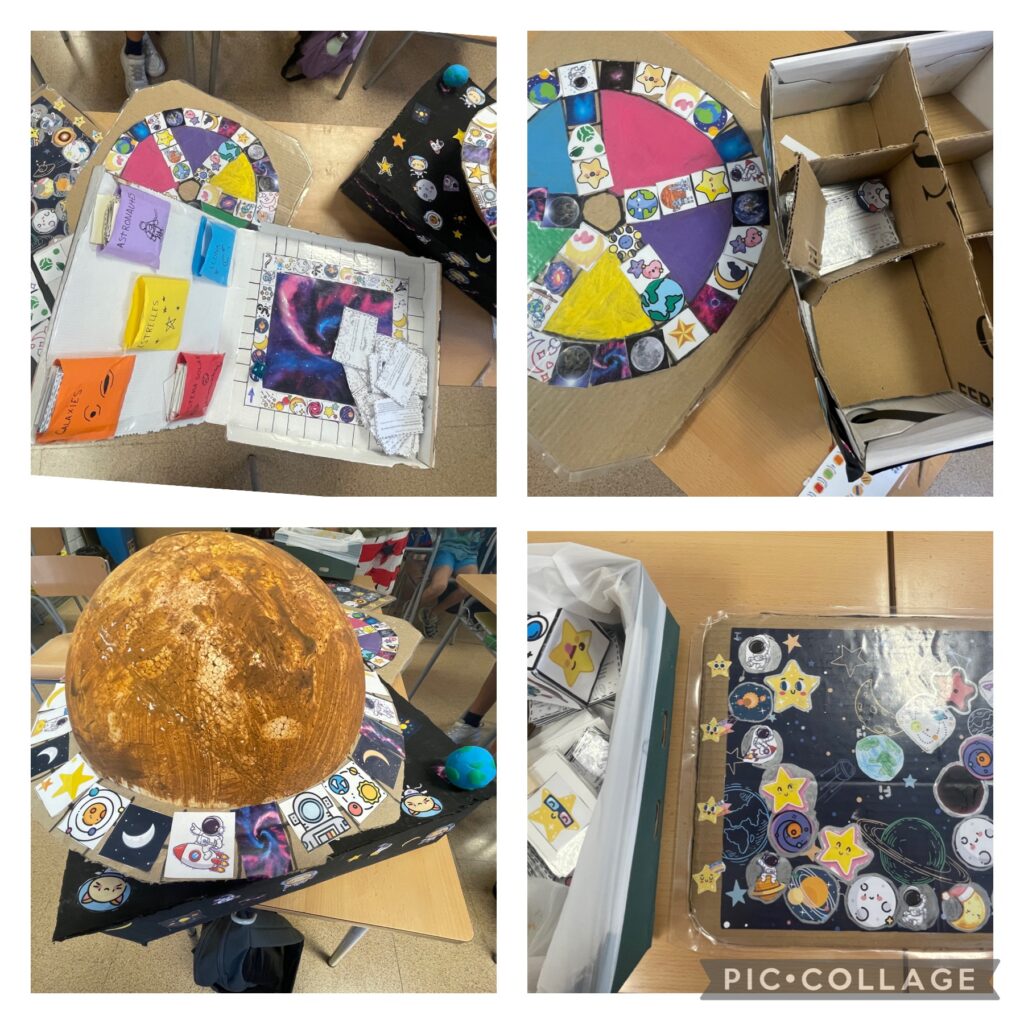 Els infants de 4t A hem creat jocs de taula cooperatius. Dins de les Situacions d’aprenentatge van crear, des de zero, quatre jocs de taula sobre l’univers. Els i les alumnes volien treballar l’astronomia així que ens vam posar a treballar. Van investigar, per grups, el sistema solar, les estrelles, el Sol, la Lluna i