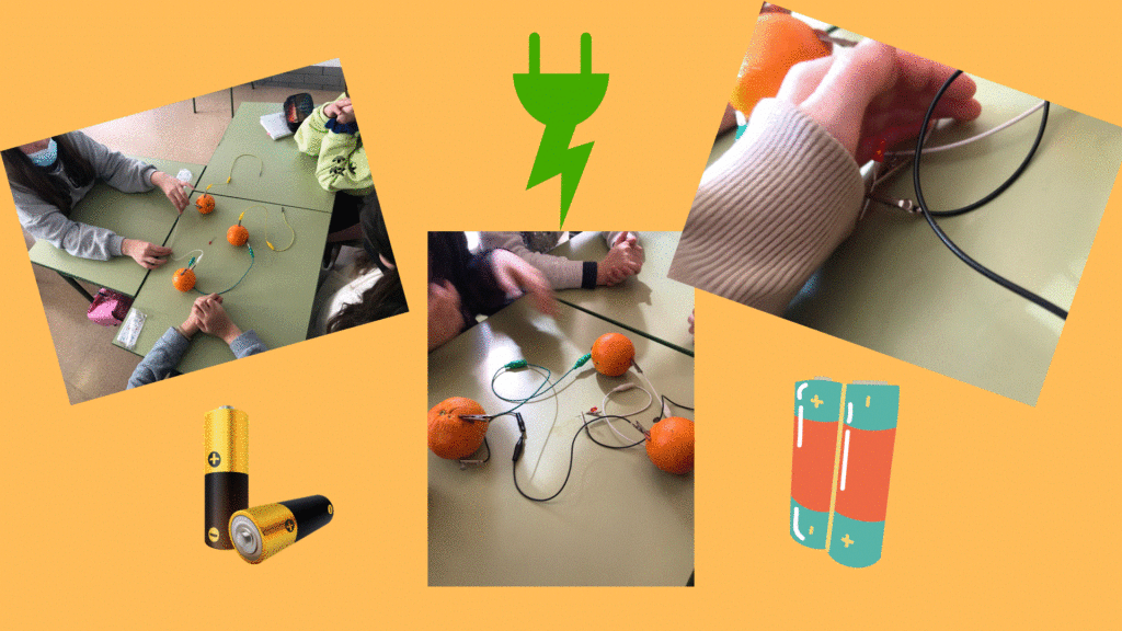 A més, aquesta tarda, aprofitant la recollida de piles per al reciclatge, ens han vingut a fer un taller i hem pogut encendre un llum només amb una taronja, una moneda i un clau. Com és això possible???