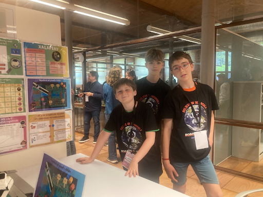 Foto: Robots en Acció, 24 de maig de 2025. En aquesta imatge, es pot veure, d’esquerra a dreta, a en Gerard, l’Ethan i el Iarden, en el seu estand del Citilab a Cornellà de Llobregat.