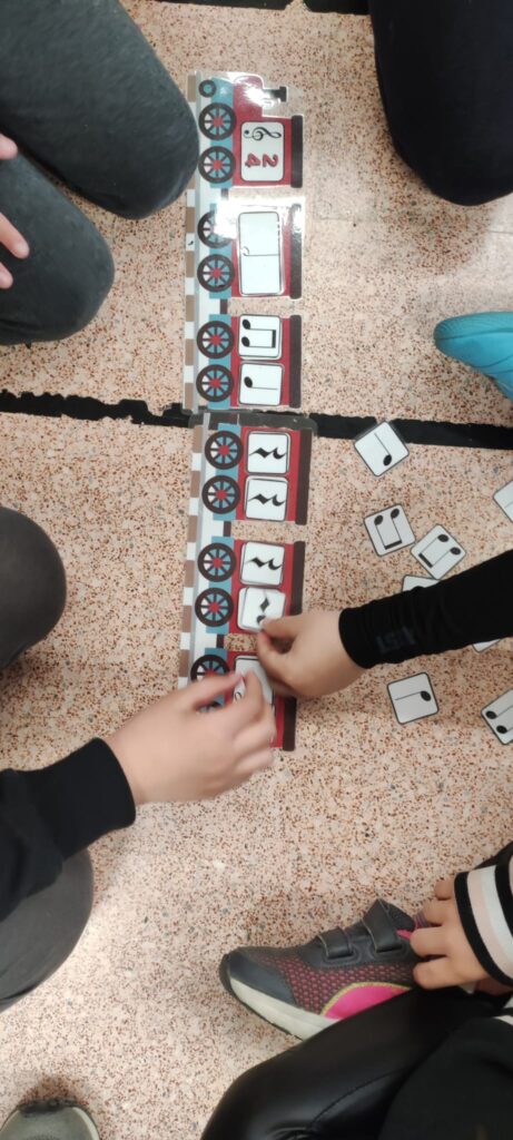 Avui els nens i nenes de segon hem fet una batalla de tres rítmics. En primer lloc hem composat un ritme difícil entre tots els integrants del grup. Tot seguit hem canviat de tren i hem col·laborat entre tots per llegir tots junts sense equivocar-nos el ritme del tren nou. D’aquesta manera hem començat a