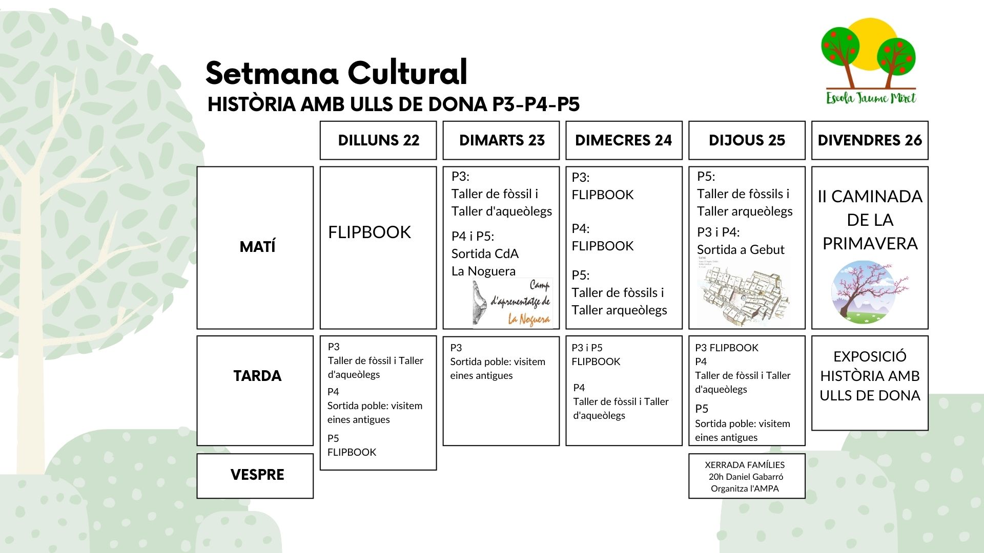 Aquí us presentem totes les coses boniques que passaran durant la Setmana Cultural que celebrarem del 22 al 26 de març a l’Escola.