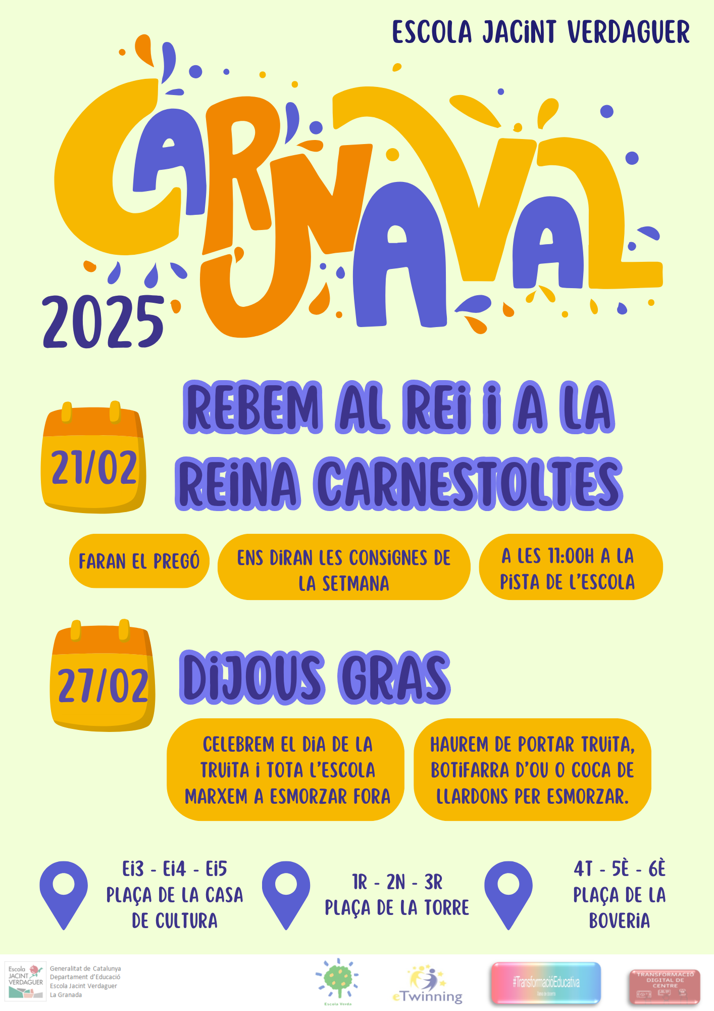 El proper dia 21 de febrer comença la gresca amb el Carnaval! Rebrem al rei i a la reina Carnestoltes a la pista de l’escola i ens diran les consignes de la setmana.