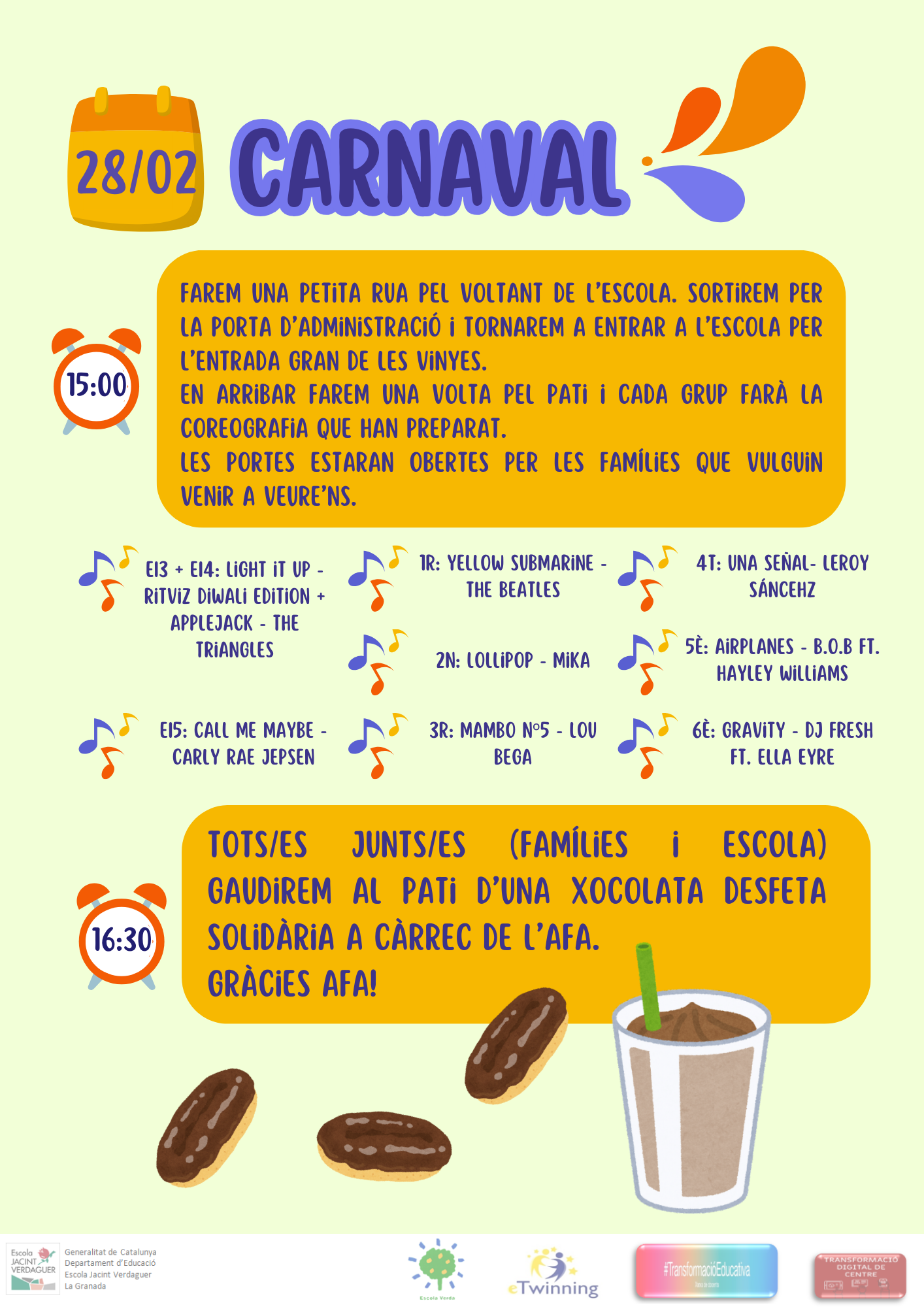 El dia 27 esmorzarem fora amb motiu del dia de la truita. I el dia 28… celebrem el Carnaval! A més, gràcies a l’AFA gaudirem d’una xocolata desfeta solidària.