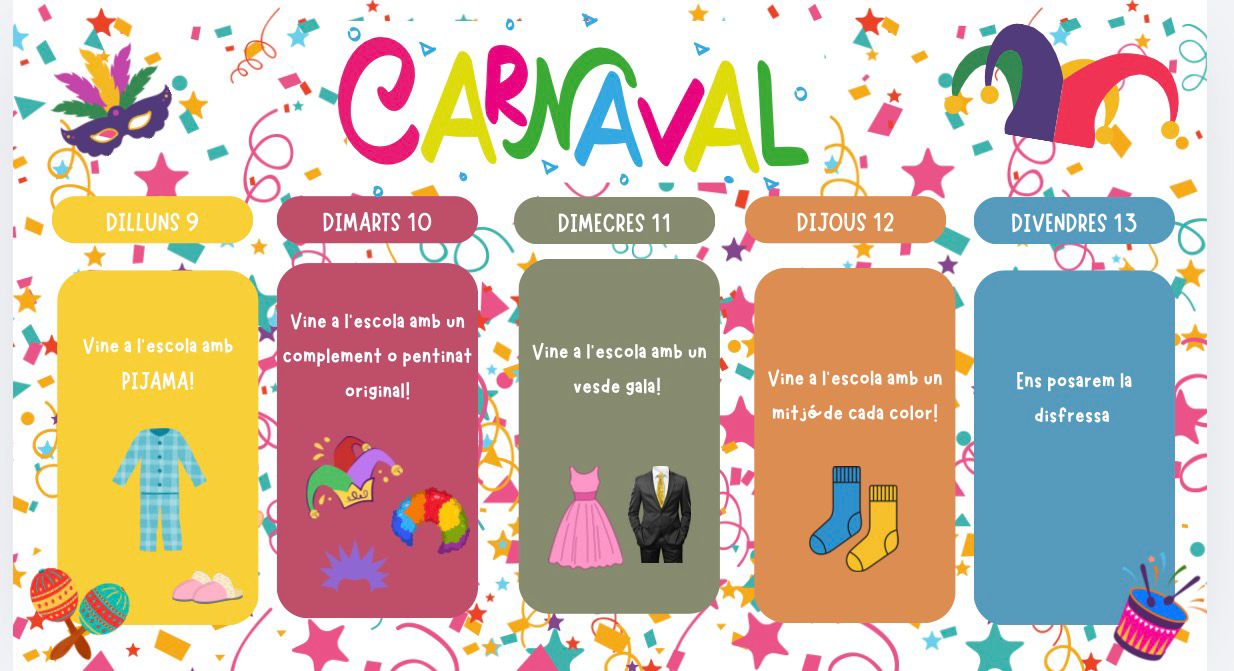 La gresca i la disbauxa ja són aquí! El Rei Carnestoltes ha arribat a l’escola carregat d’energia i ens ha deixat un seguit de consignes esbojarrades per convertir cada dia d’aquesta setmana en una festa plena de color, rialles i imaginació.