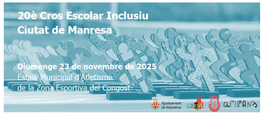 Ens fa molta il·lusió informar-vos que el pròxim diumenge 23 de novembre tindrà lloc el 20è Cros Escolar Inclusiu Ciutat de Manresa, que se celebrarà a l’Estadi d’Atletisme del Congost. Aquesta prova és puntuable per a la Fase Comarcal dels Jocs Esportius Escolars de Catalunya (JEEC) i és una gran oportunitat per viure una jornada esportiva plena de companyonia, esforç i superació personal.