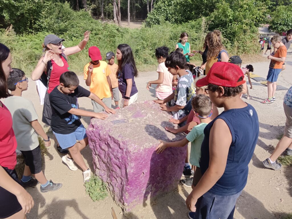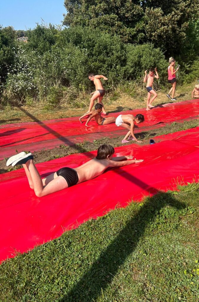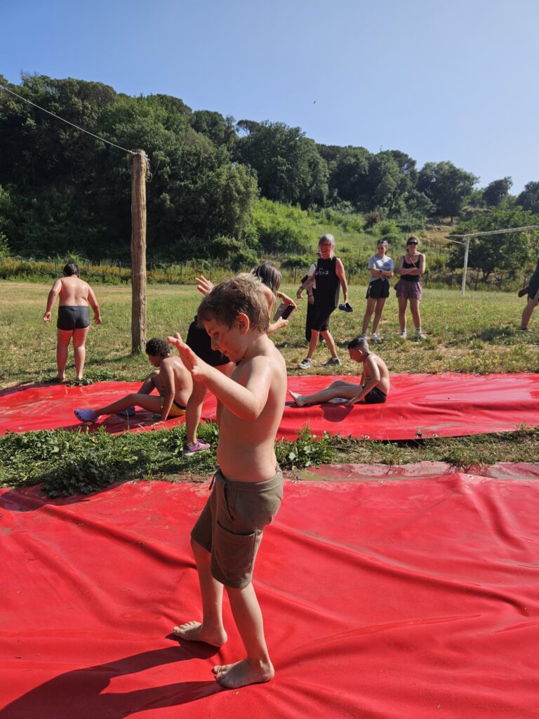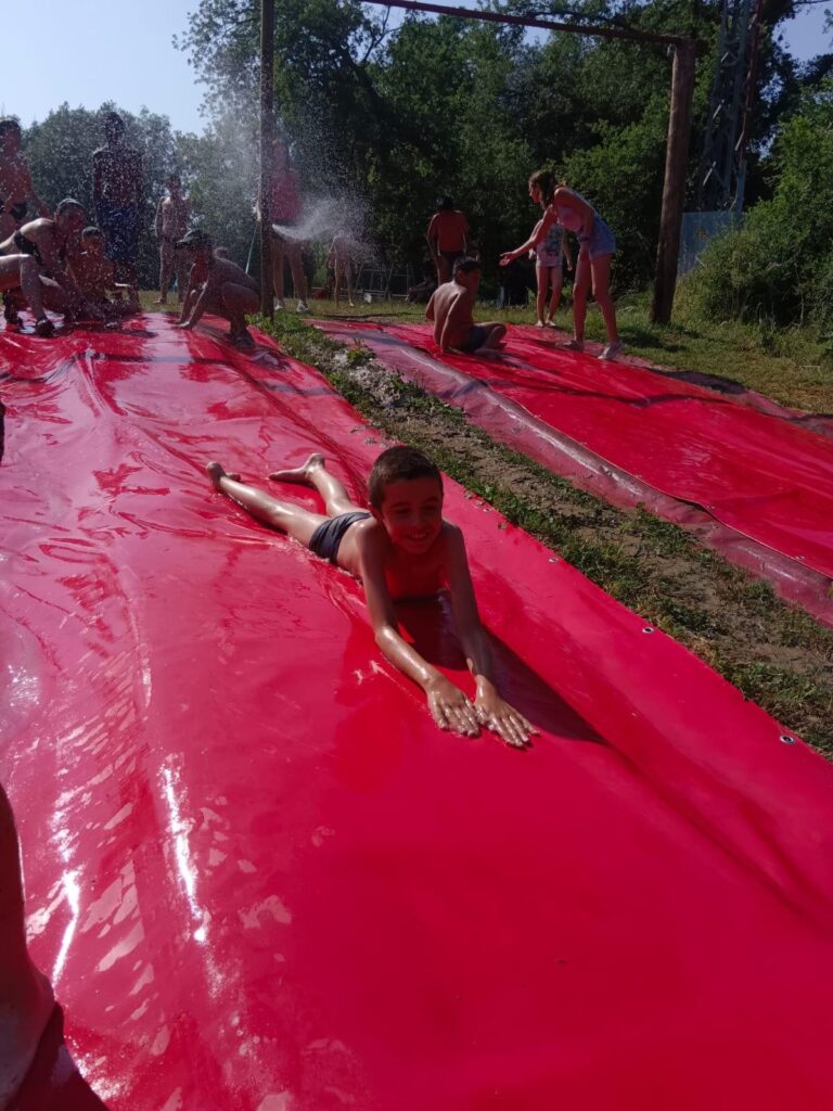 Per refrescar-se, res millor que els jocs d’aigua, el tobogan vermell aquàtic i moltes rialles passades per aigua 💦🎢. A més, van superar proves i reptes plens d’emoció: es van endinsar en un laberint, van cercar la màgica pedra lila, es van carregar d’energia i van explorar el bosc fins a trobar el follet misteriós, que els va rebre amb cançons i acordió 🎶🌲. La nit va estar plena de música, colors i alegria: una festa amb llums i discoteca on van ballar i gaudir tots plegats 💃🕺. L’endemà, encara van tenir temps per a una última passejada pel bosc, un darrera remullada i un emotiu dinar de comiat de les colònies i del curs.