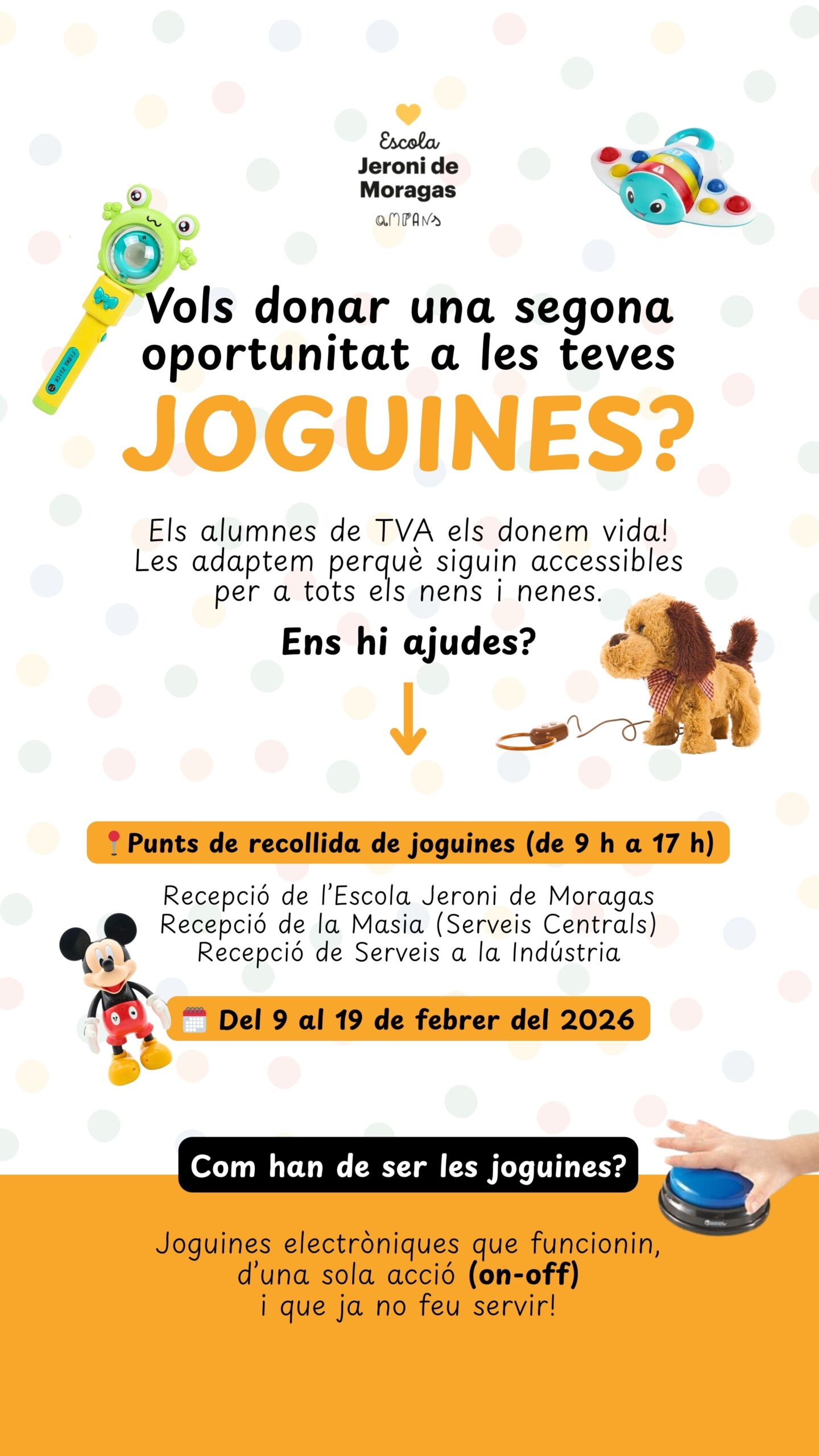 A l’Escola Jeroni de Moragas creiem en el valor de reutilitzar♻️, compartir i fer créixer les oportunitats de tots els infants i joves. Per això, posem en marxa una campanya de recollida de joguines electròniques amb un doble objectiu: donar una segona vida a joguines que ja no s’utilitzen i convertir-les en recursos accessibles per als nostres alumnes.
