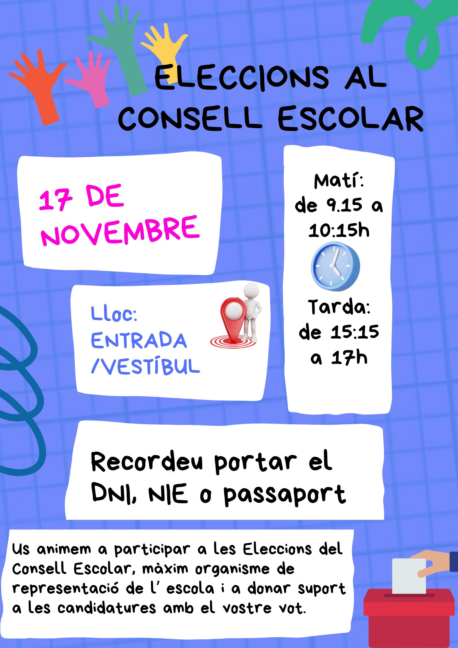 | 17 de novembre | Votació sector pares/mares (de 9:15h a 10:15h i de 15’15 h a 17h) |
