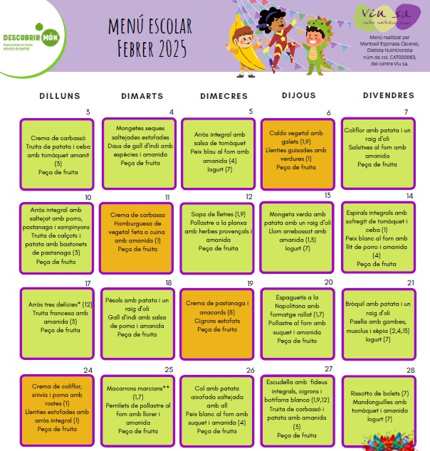 Us compartim el menú del mes de febrer. Fent clic sobre la imatge, s’obriran totes les opcions de menú disponibles.