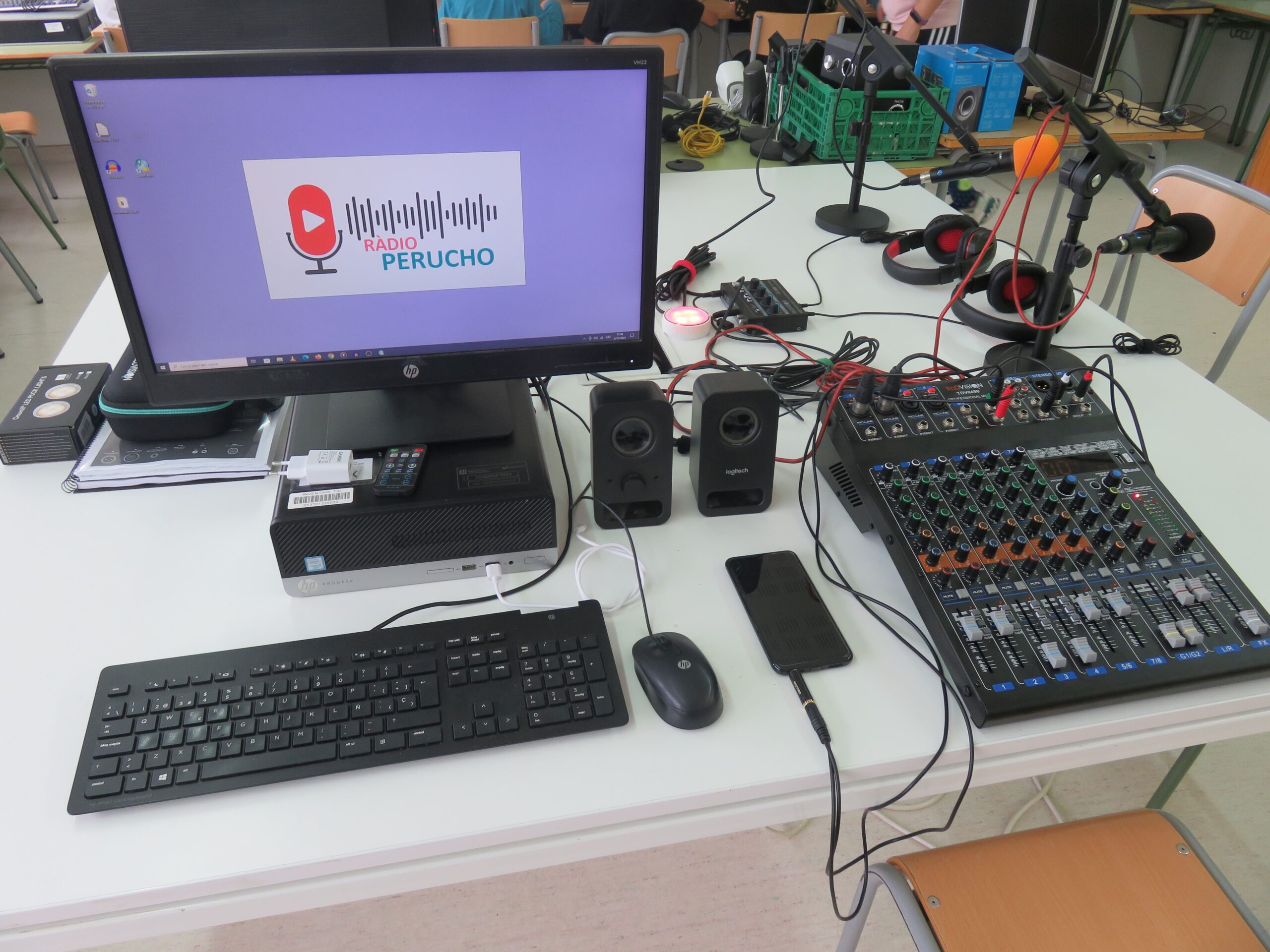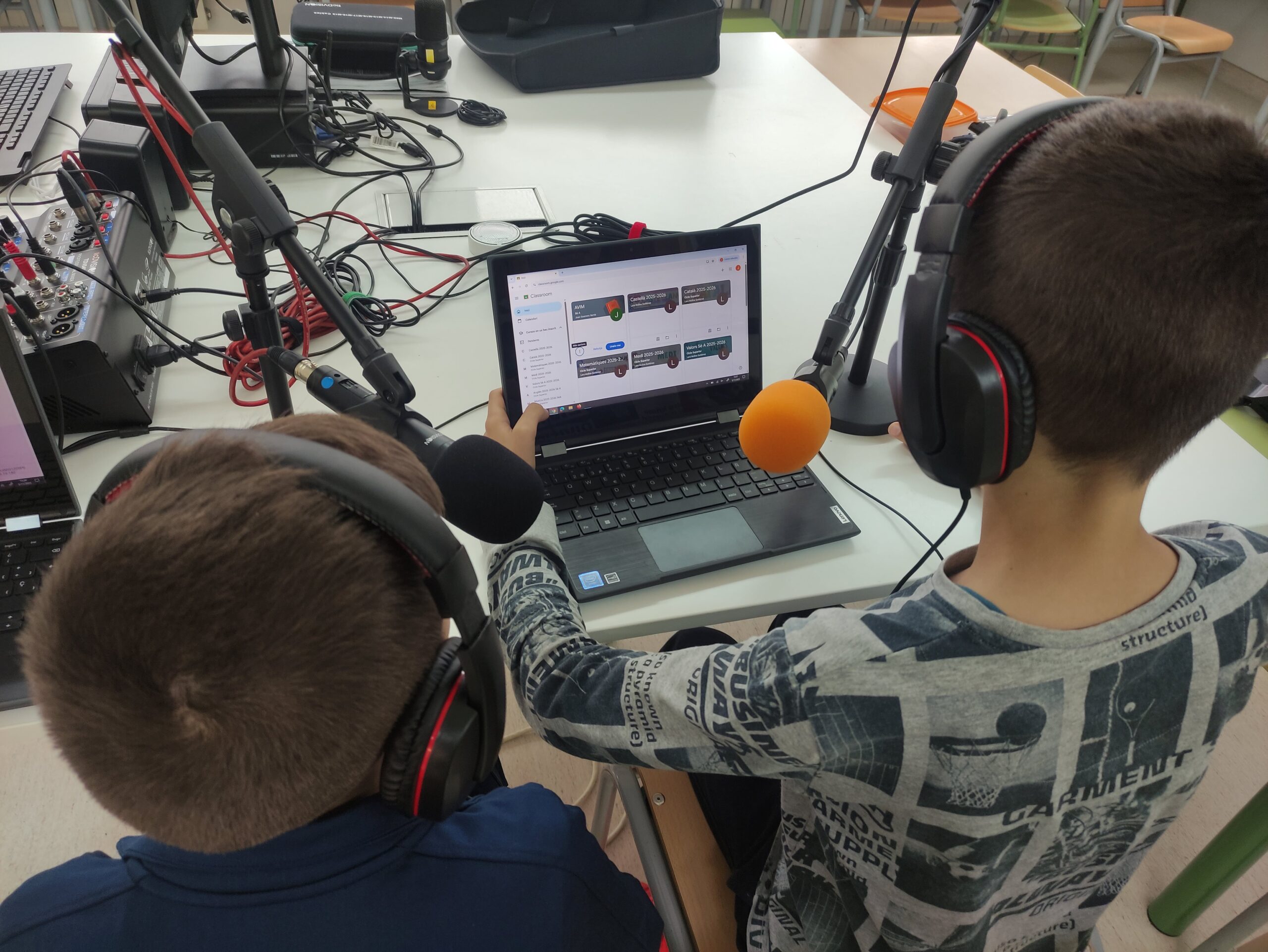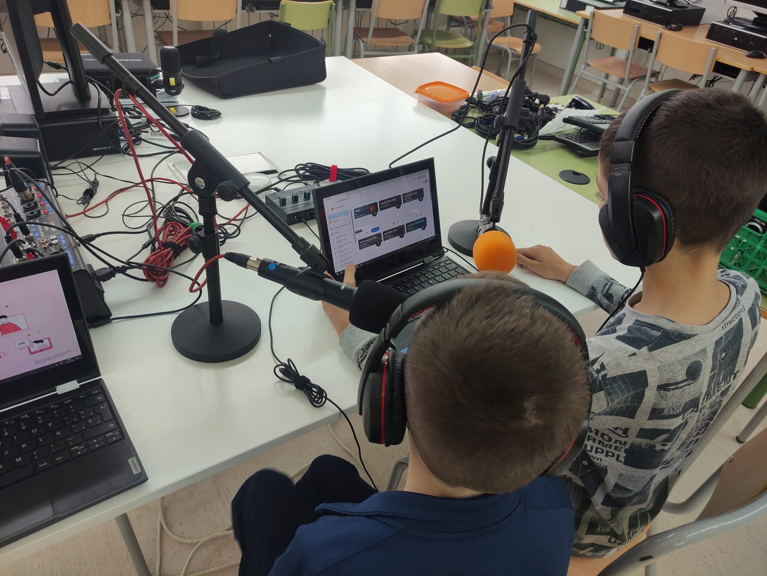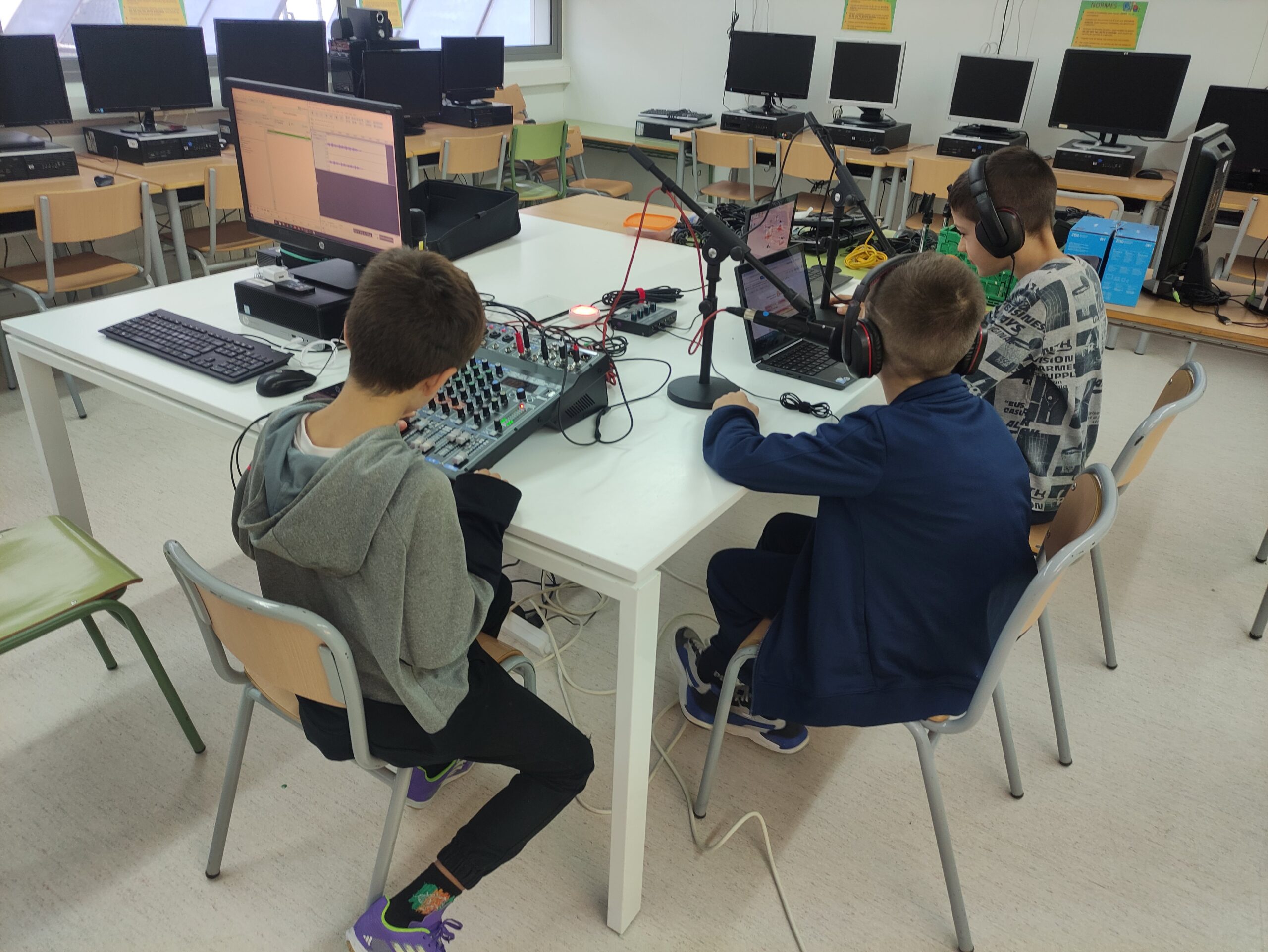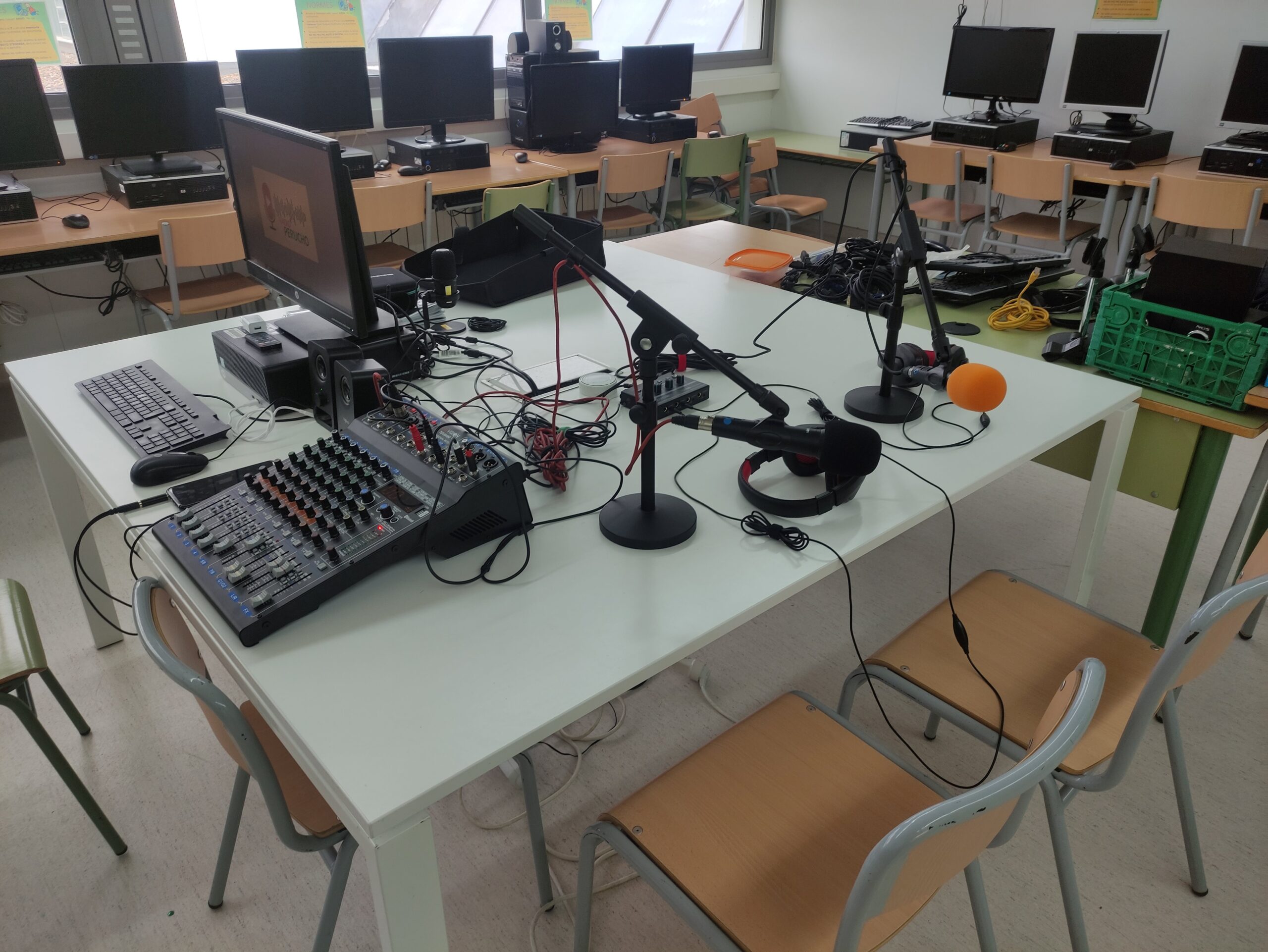 Aquest curs hem pogut estrenar el nou estudi de gravació a l’escola que ens permet fer programes de ràdio i productes audiovisuals amb uns mitjans semblants als que tenen els estudis professionals, tot i que més senzills.