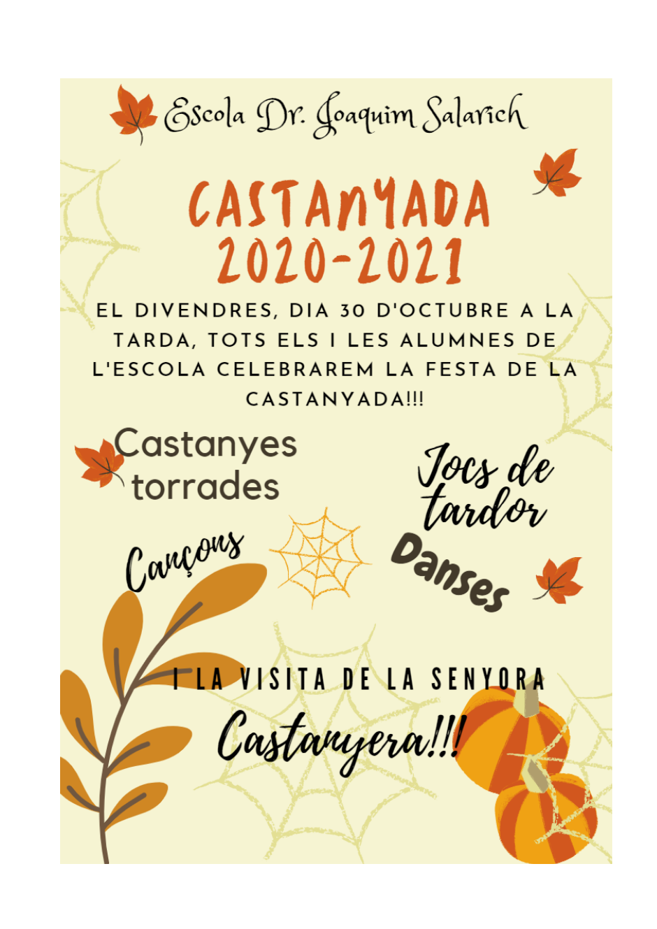 Aquest any, la situació de pandèmia actual, no ens permetrà poder celebrar la tradicional Castanyada amb tots vosaltres. Tot i així , els i les alumnes si que ho faran com es mereixen.