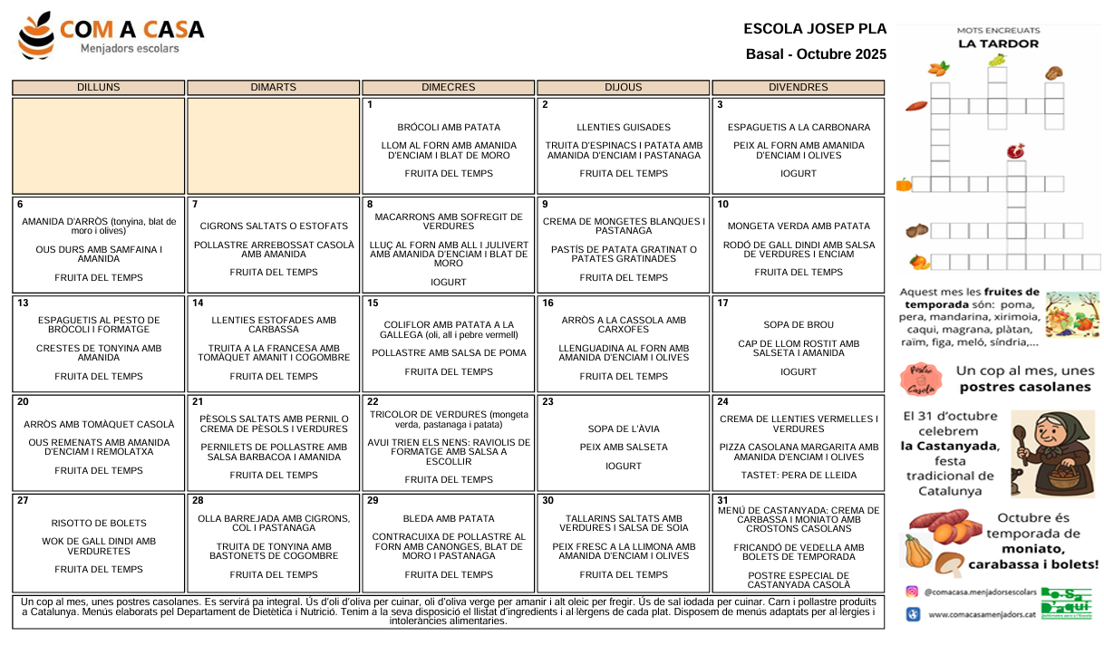 Menú d’Octubre Feu un comentari / Per Iván Ollé / 1 d'octubre de 2025 / Comunitat d'Aprenentatge General Menjador Escolar Portada / escola, general, informació, jpla, menjador Benvolgudes famílies,Us deixem el menú d’octubre. Bon profit!!!
