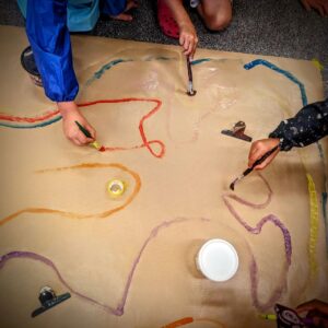 L’alumnat de cada grup havia de fer un camí amb pintura, intentant esquivar els obstacles que anaven trobant pel paper. L’últim dia, van dibuixar-se a ells/es mateixos/es i van situar-se dintre aquella mini-ciutat creada entre tots/es i van dibuixar, també, tot allò que volien que tingués el seu espai.