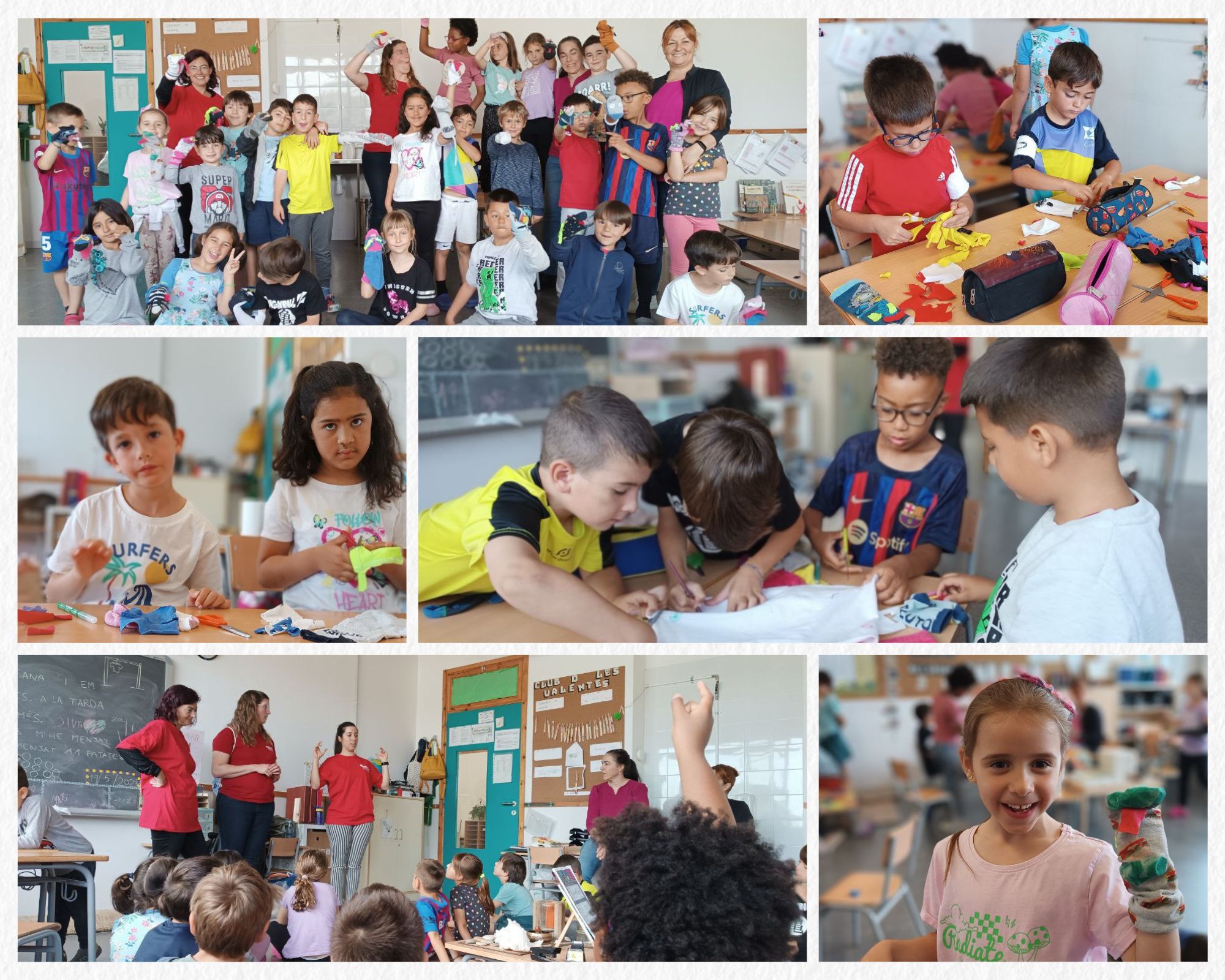 Aquí teniu una mostra dels dos tallers que hem fet: recuperar roba que ja no es podia utilitzar per a convertir-la en collarets i bosses i crear titelles a partir de mitjons desaparellats.