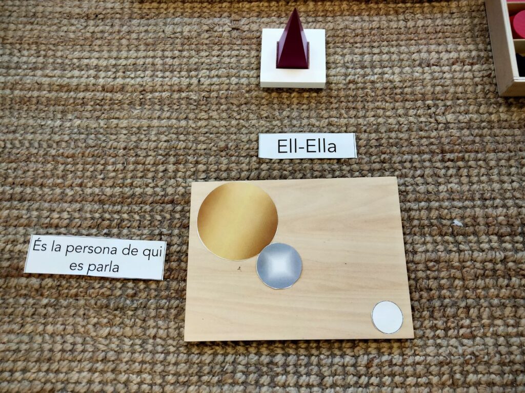 A partir d’aquí hem elaborat un conjunt de frases: “La Martina balla”, “En Manel salta”, “La Dolors juga”… Així doncs, hem preguntat de quina manera podíem substituir el nom de la persona per una altra paraula més curta. A través d’unes targetes hem començat a classificar i a prendre consciència de la funció de cada pronom personal.