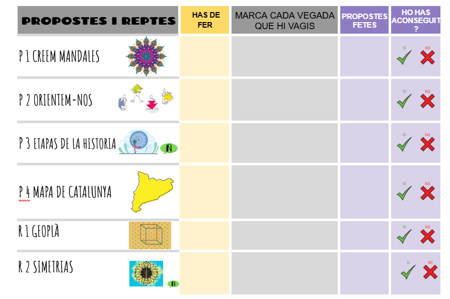 La novetat d’aquest curs és que cada color té un grup assignat, per exemple, “grup lila 1” o “grup lila 2” i aquest es manté al llarg de tot el trimestre a la mateixa aula on hi ha unes propostes i reptes determinats. Al tercer trimestre es realitza un canvi a la inversa i els grups canvien d’aula. Així doncs, aquest curs s’ofereixen les següents propostes: