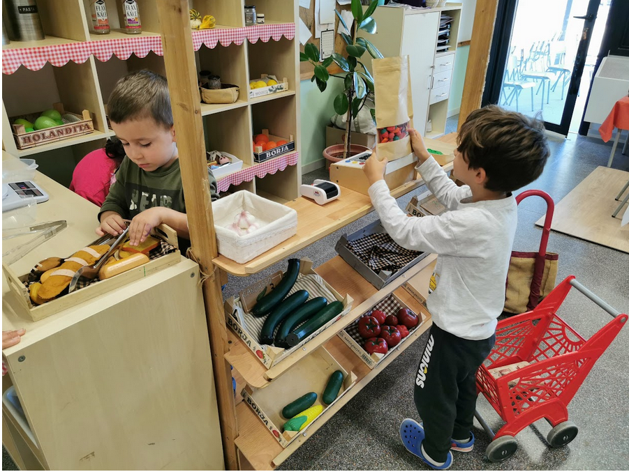 A l’Espai Imagina’t els infants poden recrear situacions de la vida quotidiana, desenvolupar el llenguatge i les habilitats socials a través del joc simbòlic. Aquest espai està ambientat en l’entorn proper, “el poble” , i podem trobar: la botigueta, l’hospital, el taller…entre d’altres. A més a més, a través de jocs manipulatius també es treballa la motricitat fina, la qual és molt important per iniciar-se en l’escriptura.