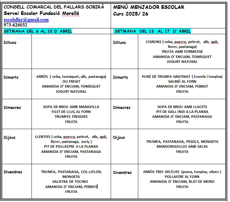 Menú 1ª quinzena d’ abril
