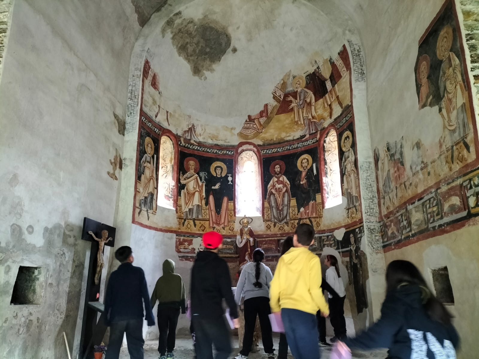Per acabar, vam tornar a entrar per veure les pintures i ens van explicar com les van fer i que les van portar a Barcelona, al Museu Nacional d’Art de Catalunya. La Neus, mestra del Camp d’Aprenentatge, ens va dir que miréssim els ulls d’un personatge. Vam descobrir que si miràvem els ulls dels personatges pintats, semblava que ens perseguien amb la mirada. També, ens van explicar que hi havia unes pintures amagades que no havien descobert el primer cop. Eren els fills de Llucia i Artau; Ot, Artau i Llucia Maria.