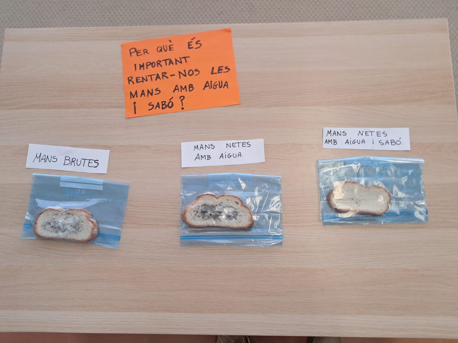 Aquesta setmana els nens i les nenes de segon hem fet un experiment per iniciar els projectes dels hàbits saludables. Hem intentat descobrir què li passa a una llesca de pa remenada amb les mans brutes, netes amb aigua o netes amb aigua i sabó. El resultat ens ha confirmat que cal rentar-nos les mans abans de menjar!