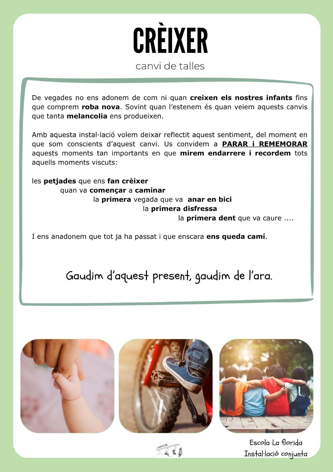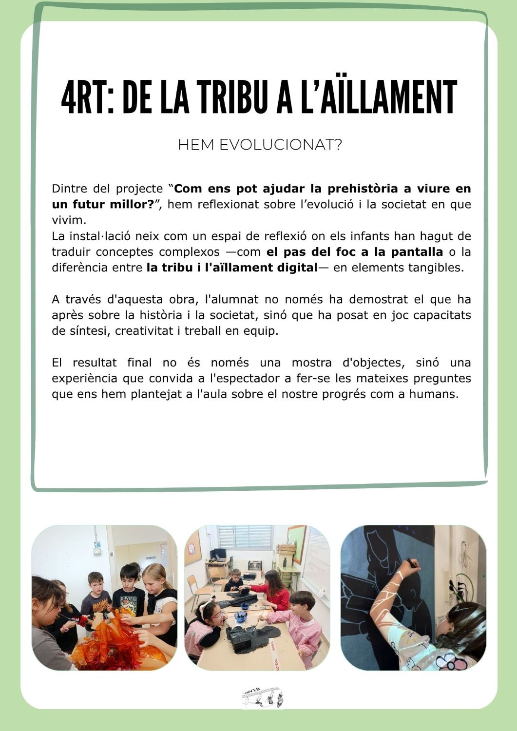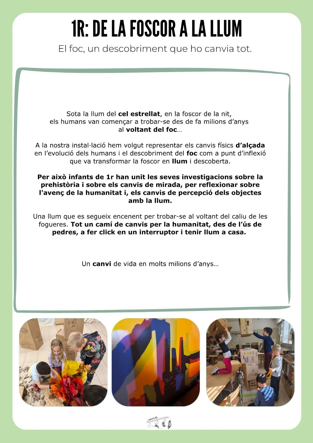 Un any més, la nostra escola es posa de gala per compartir amb tots i totes més ART que mai. En aquesta ocasió la paraula CANVI, ha inspirat a Petits, Mitjans i Grans a crear diferents instal·lacions que han convidat a tota la comunitat educativa a interpretar i a imaginar.