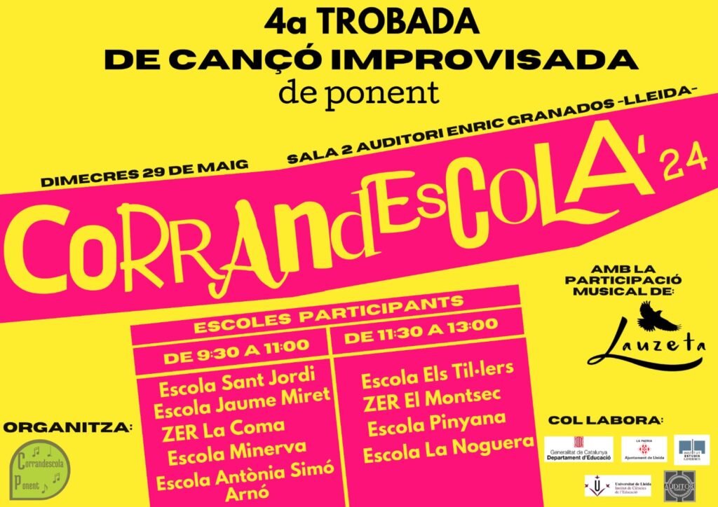 Tot seguit teniu l’enregistrament de la IV Trobada de cançó improvisada escolar de ponent (2n torn). L’alumnat de 6è de l’Escola hi va participar el passat dimecres 29 de maig del 2024. Es va celebrar a la Sala 2 Auditori Enric Granados de Lleida. de les 11.30h. a 13h. Les escoles participants van ser: ZER